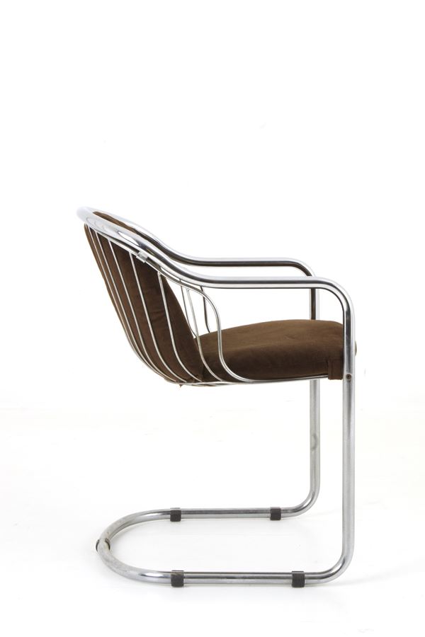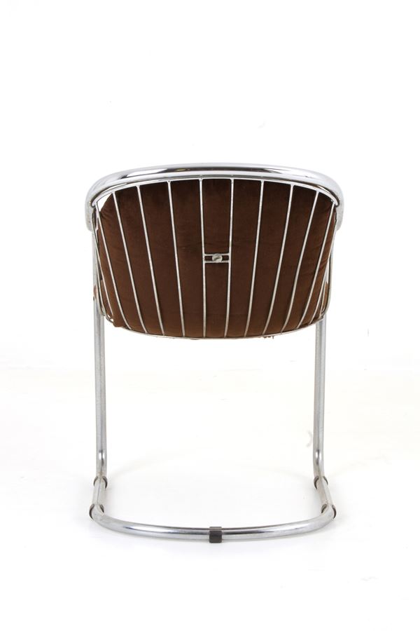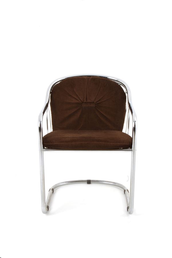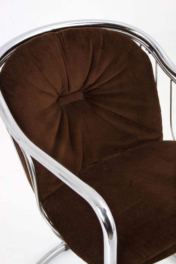 Four chairs in chromed tubular metal with brown velvet cover. FASEM ITALIA production. 1980s.