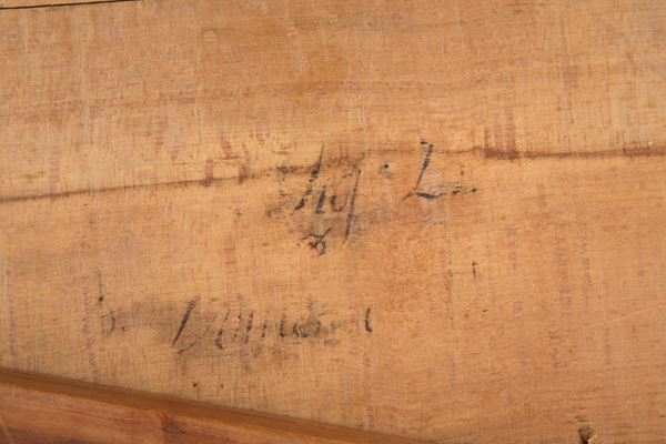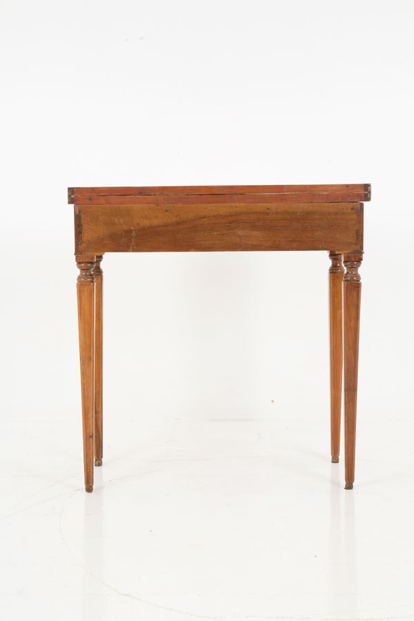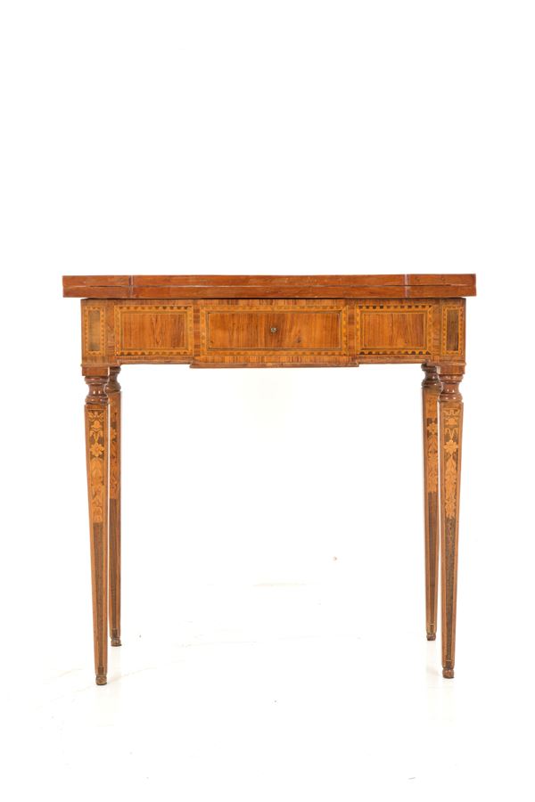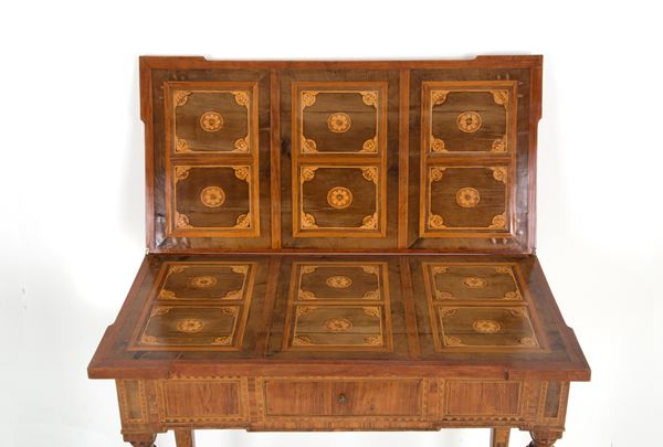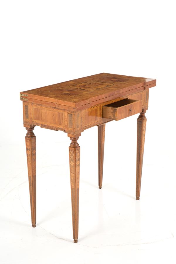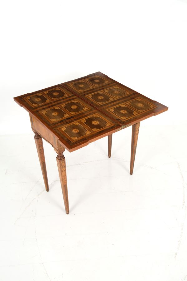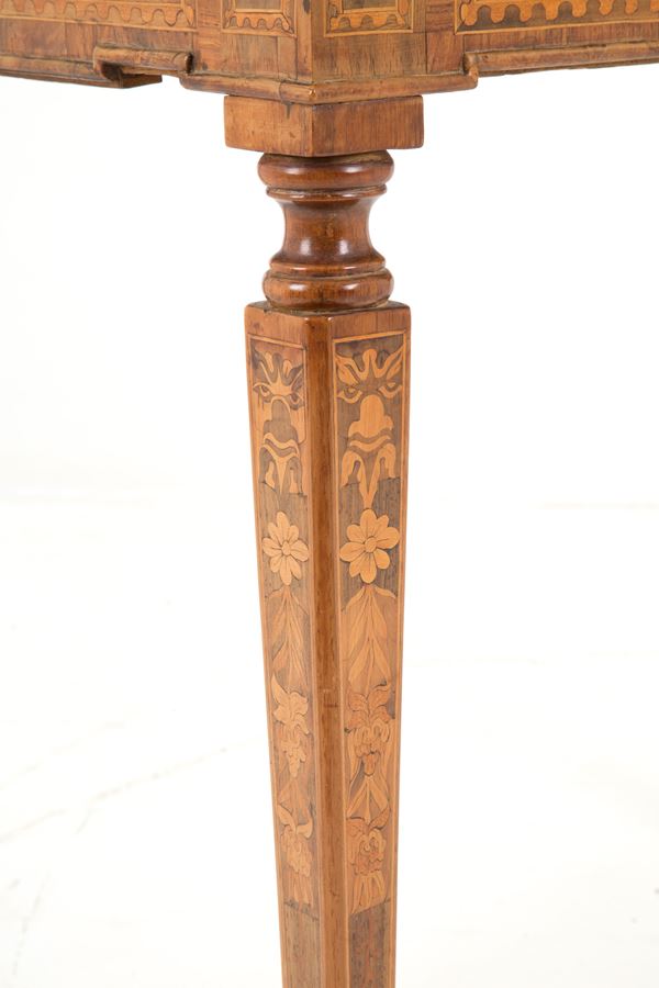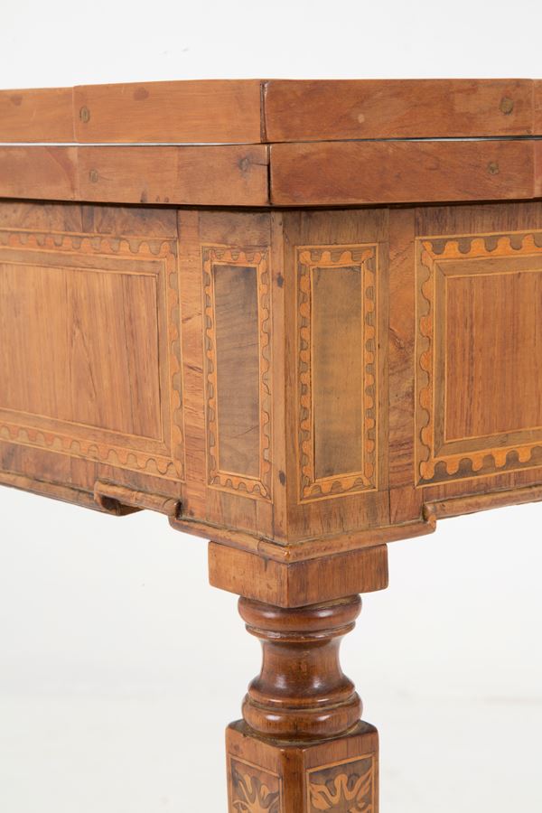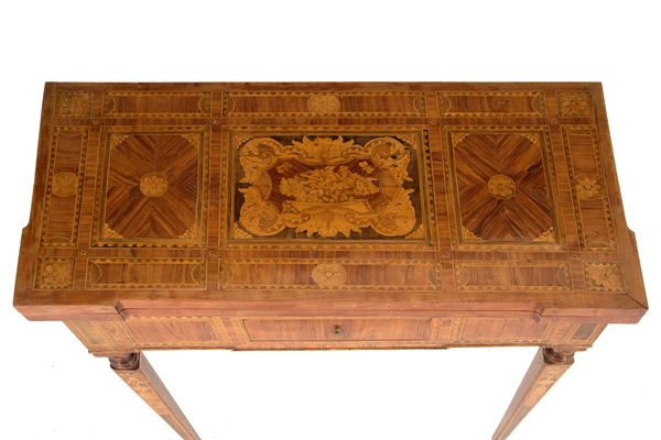 Coffee table inlaid in precious woods with geometric and floral motifs and butterflies with opening top. Fragments of signature inside. Louis XVI.