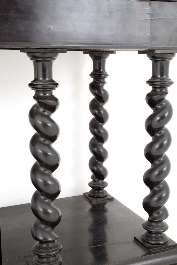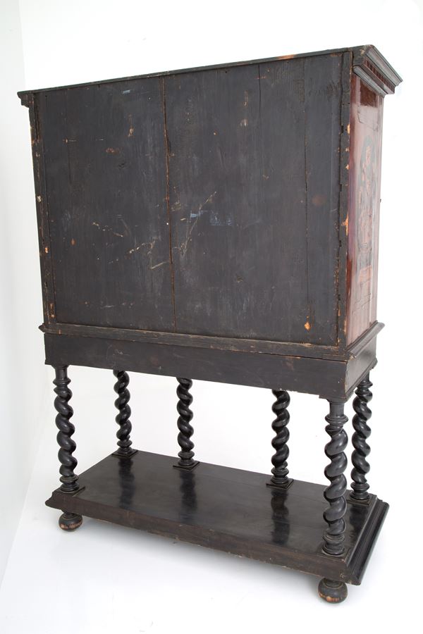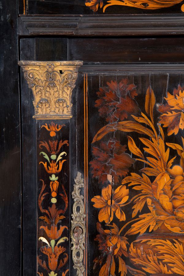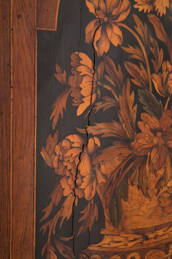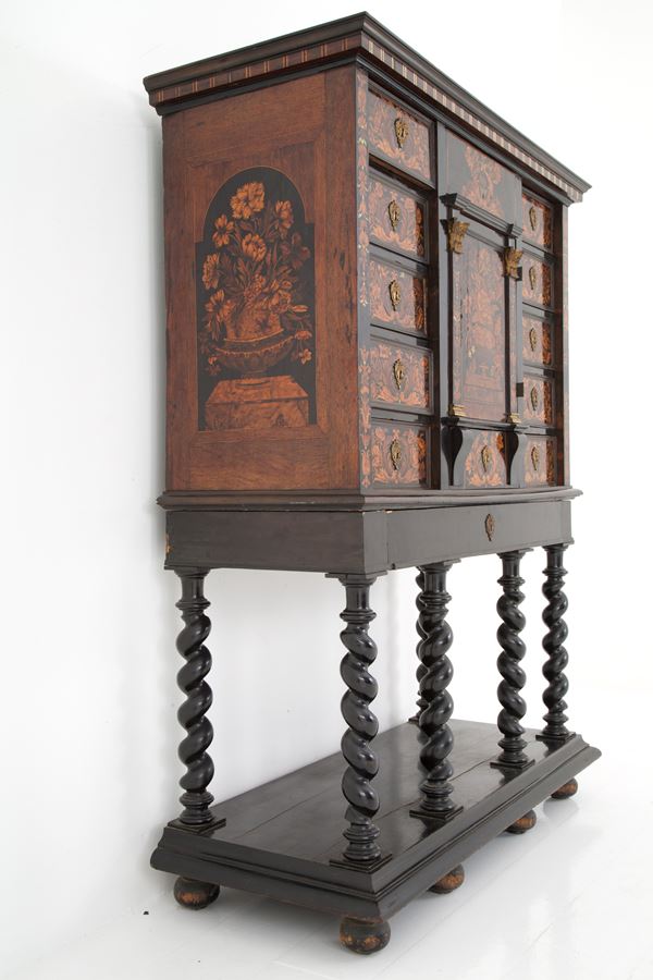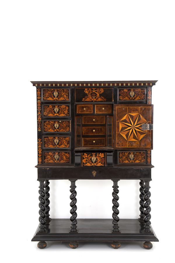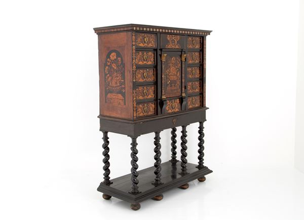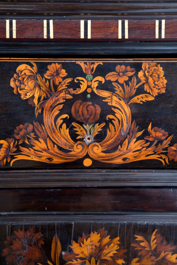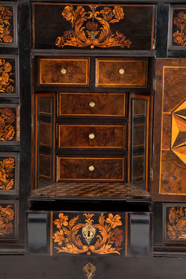 Important coin cabinet in veneered wood and inlaid in various woods with floral motifs. Base in ebonized wood.