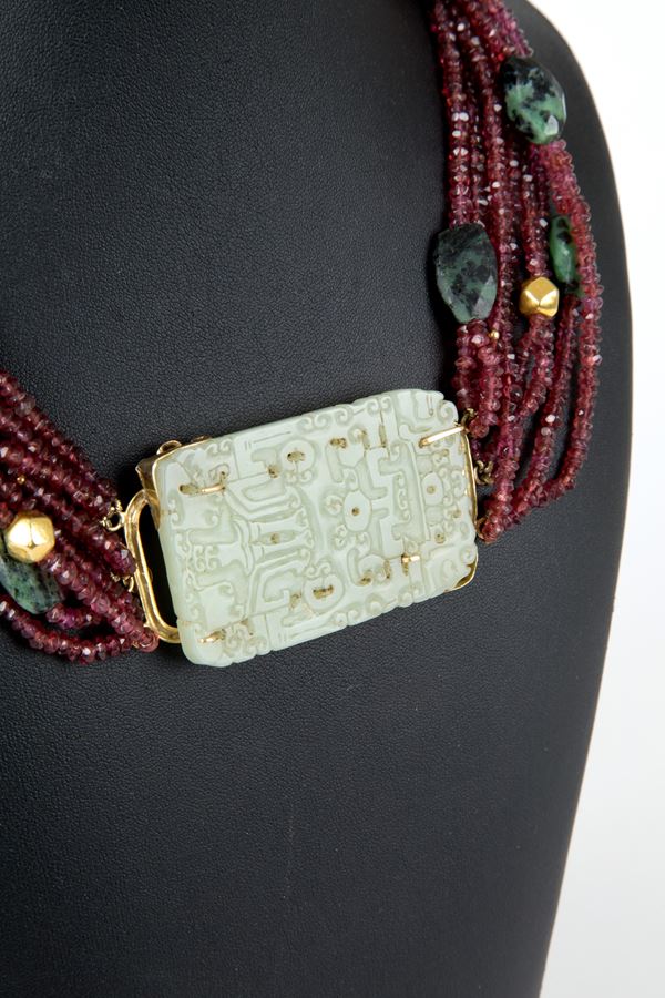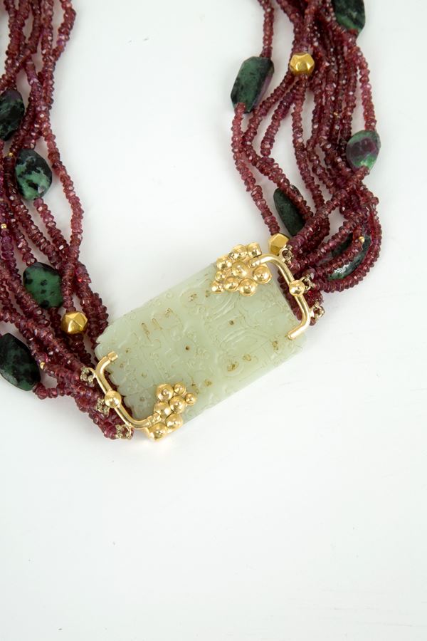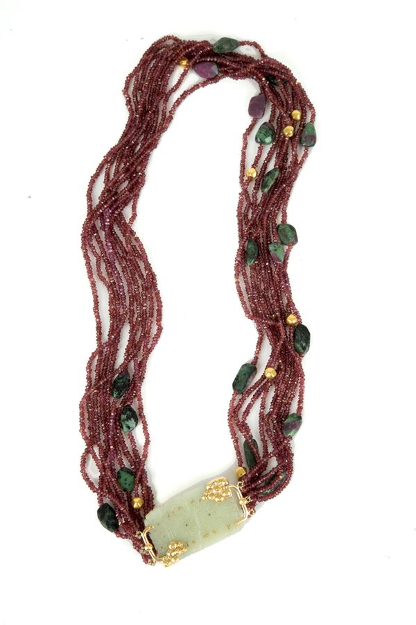 Jade and gold necklace with glass beads and hard stones. China. 19th century.
