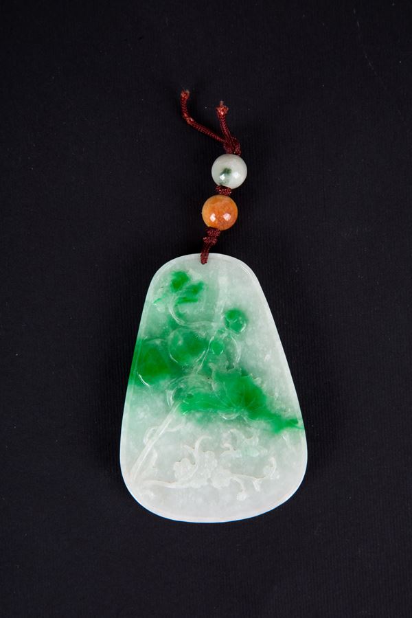 Pendant in white and green jade carved with a salamander among vegetation. China. Republic period.