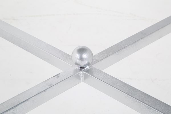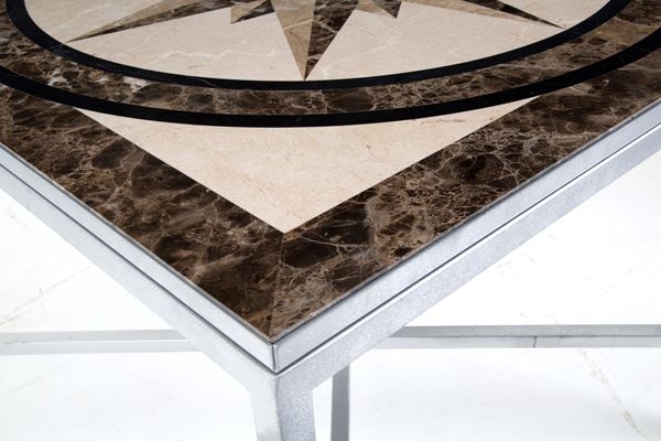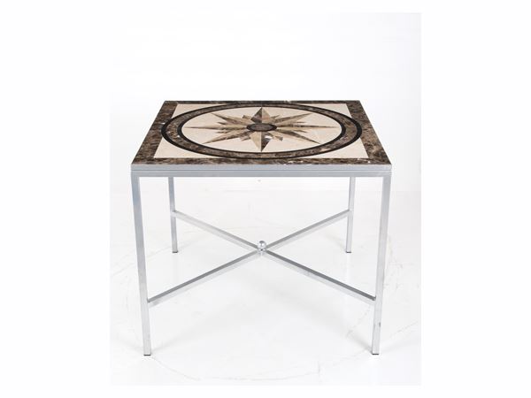 Square table in painted metal veneered in various marbles. 20th century.