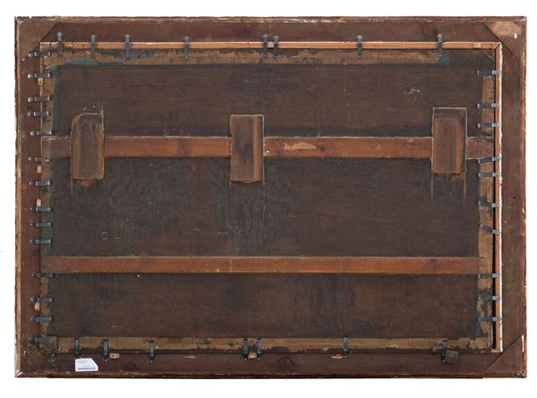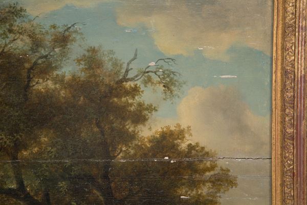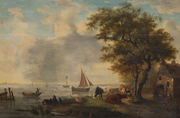 Oil painting on panel depicting "LAKE LANDSCAPE WITH COWS AND BOATS". Late 18th-early 19th century. In a gilt frame. Defects.