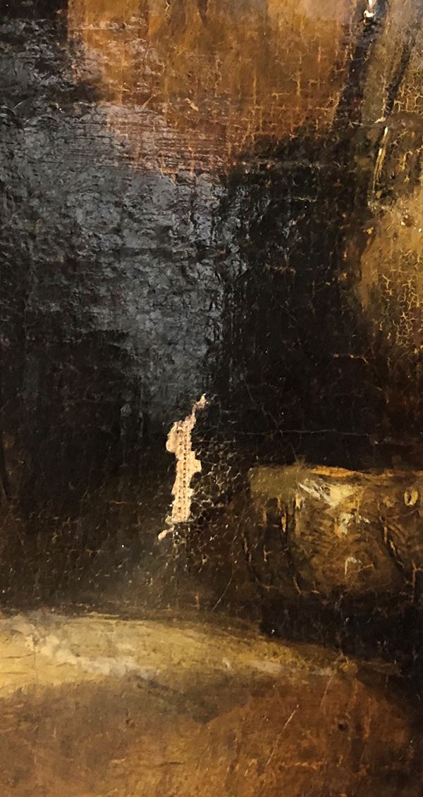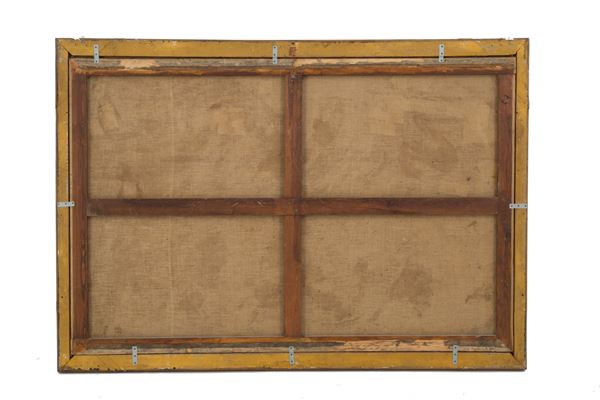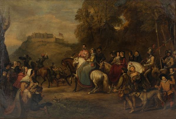 Oil painting on canvas depicting "RETURN FROM THE HUNT". In a gilt frame. Defects and restorations. Already relined.