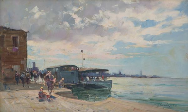 Oil painting on tablet depicting "VENICE, MURANO WATERBUS STOP". Signed lower right. Countersigned and titled on the reverse. in frame.