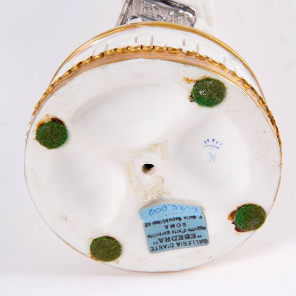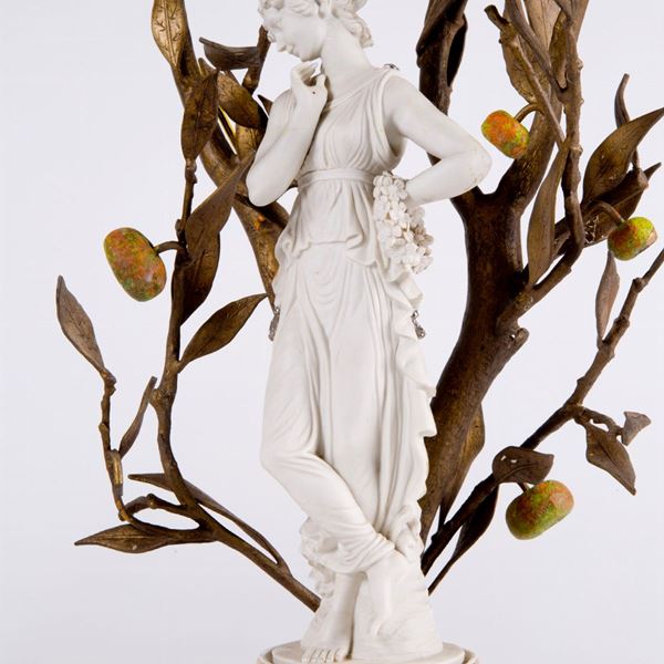 Pair of bronze candlesticks with white porcelain sculptures. 19th century.