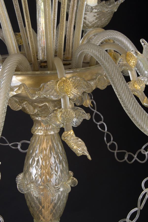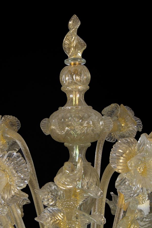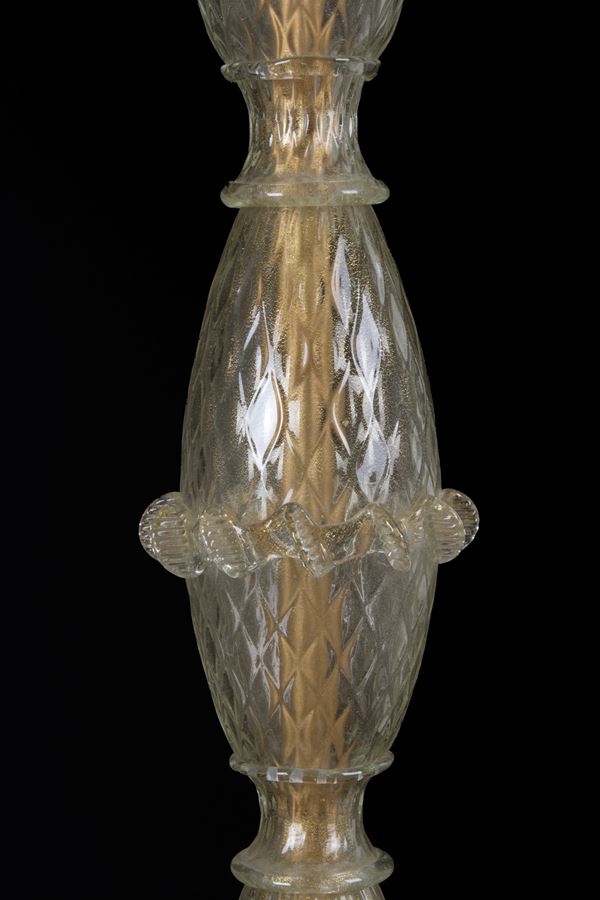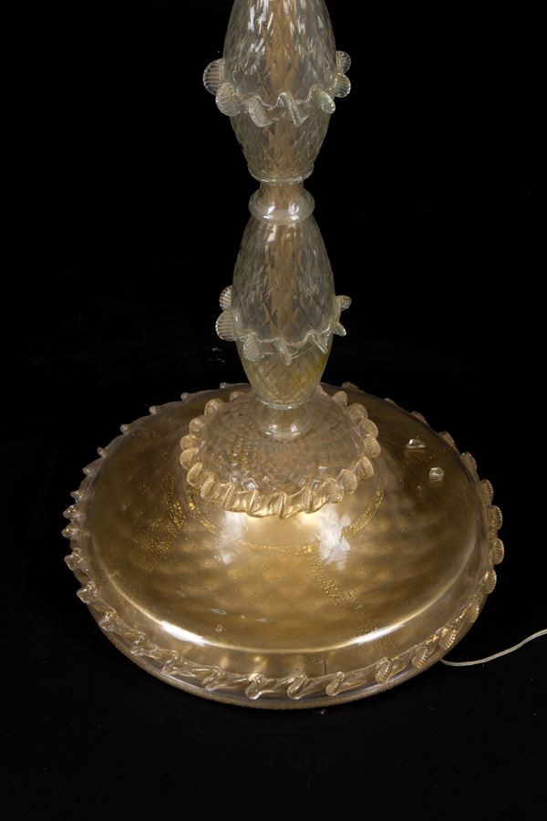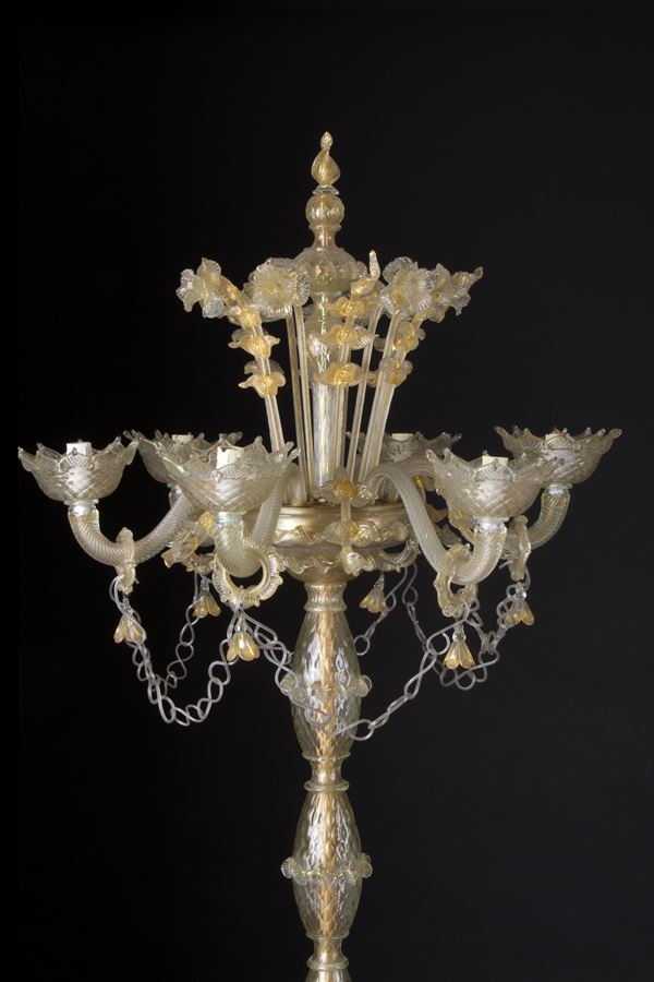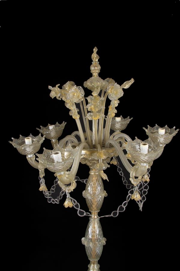 Pair of six lights floor lamps in Murano glass with flowers and leaves. 20th century. One missing a leaf and a flower.