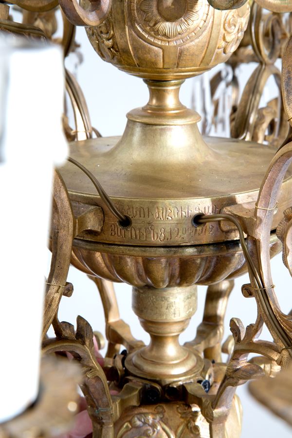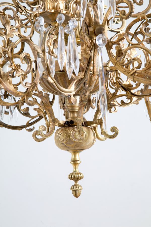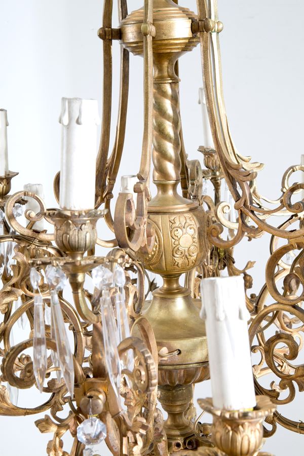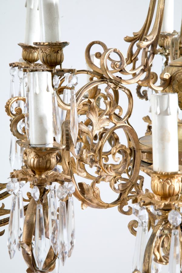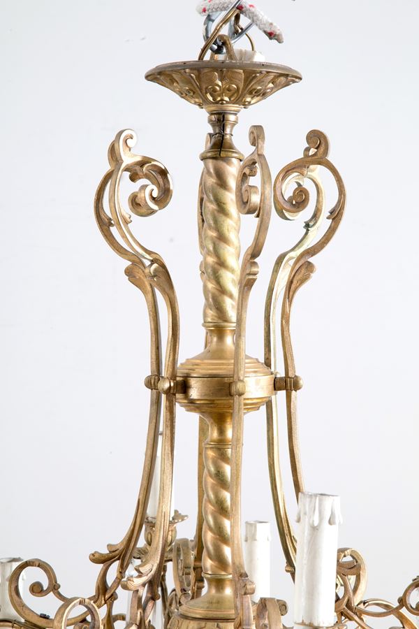 Chandelier with six arms in chiseled and gilded bronze. Early 20th century.