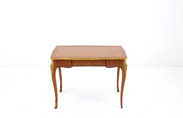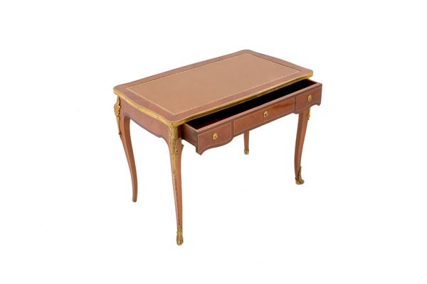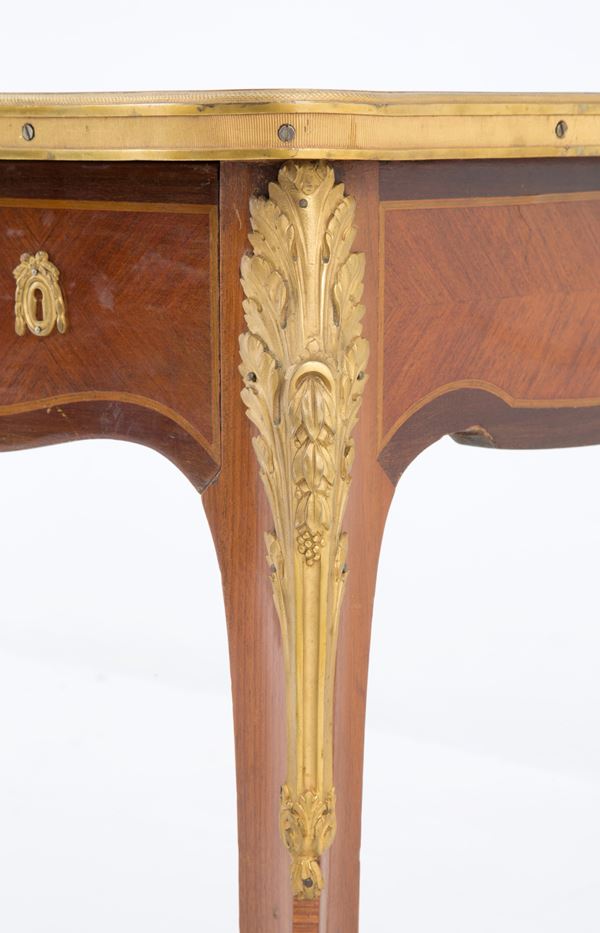Small desk veneered in bois de rose with finely chiseled and gilded bronze finishes. Missing a bronze slipper.