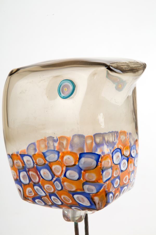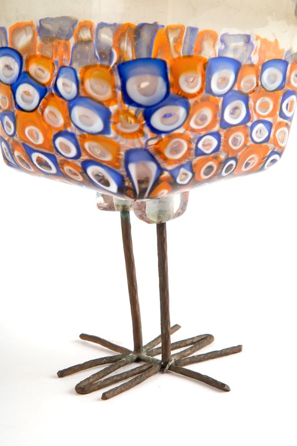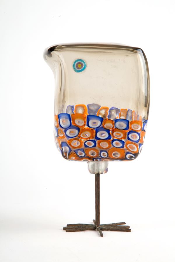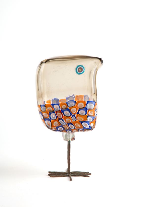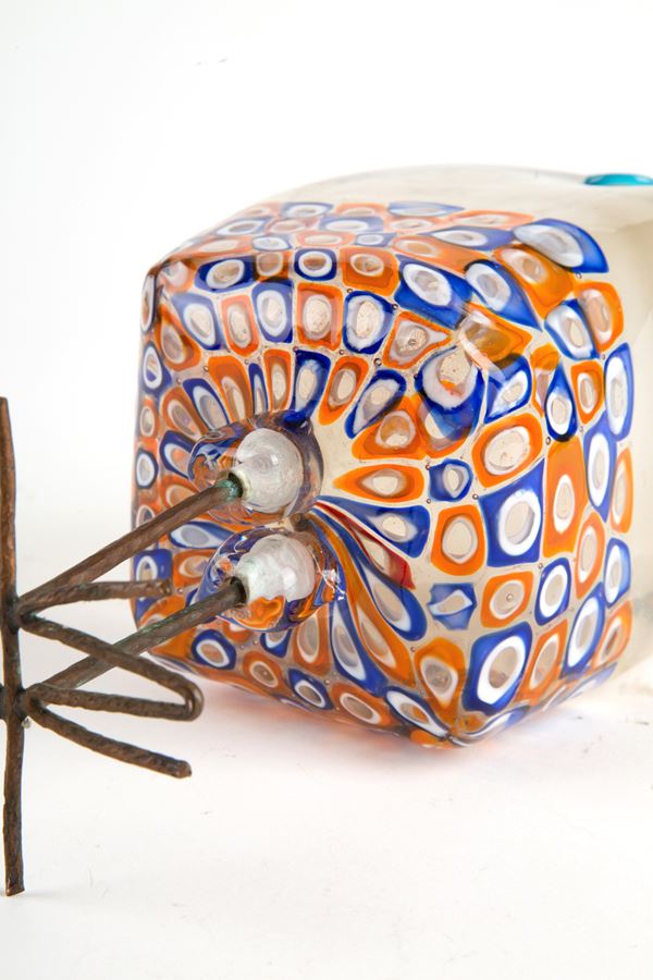 Transparent blown glass sculpture with inclusion of murrine depicting "PULCINO". Small copper paws and hot applied murrina eyes. VISTOSI production. Murano. 1964 approx.