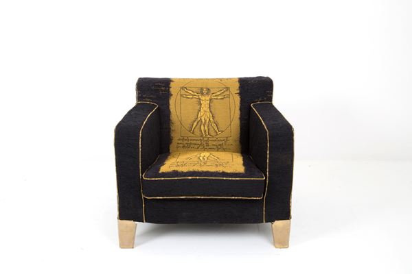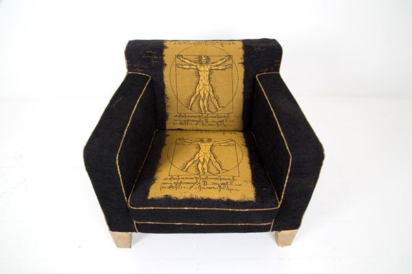 Two Cubis armchairs with fabric depicting "UOMO VITRUVIANO". Steel feet covered in fabric. B&B ITALIA production. With labels under the seats. Small signs of wear.