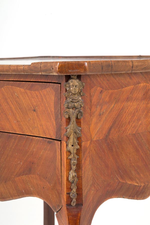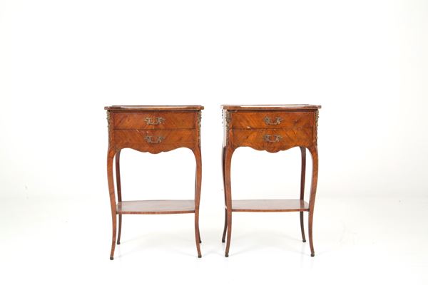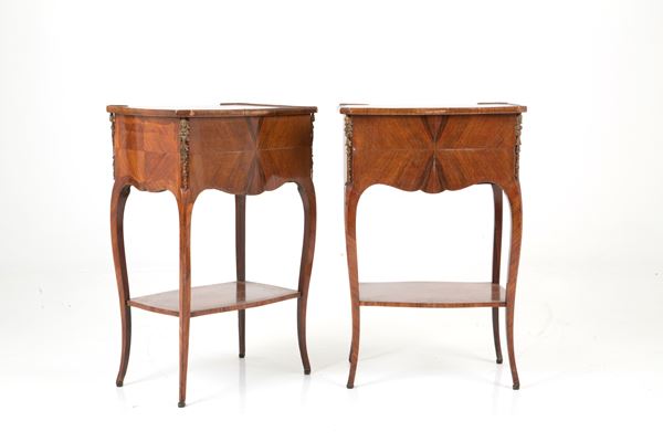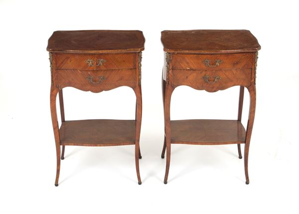 Two bedside tables veneered in bois de violette with gilt bronze trimmings, two drawers and lower tablet. Late 18th century. Slight flaws.