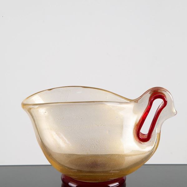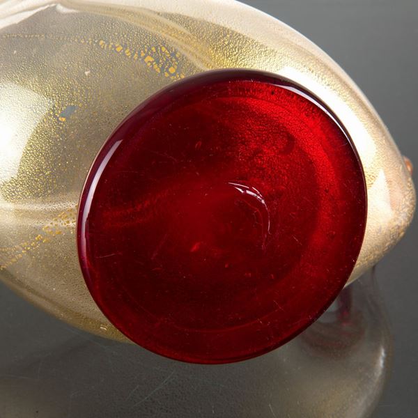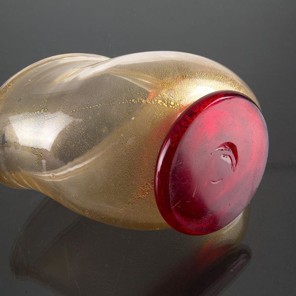 Jug in Murano blown glass highlighted in gold with red base and internal profile of the handle. 1930s-40s.