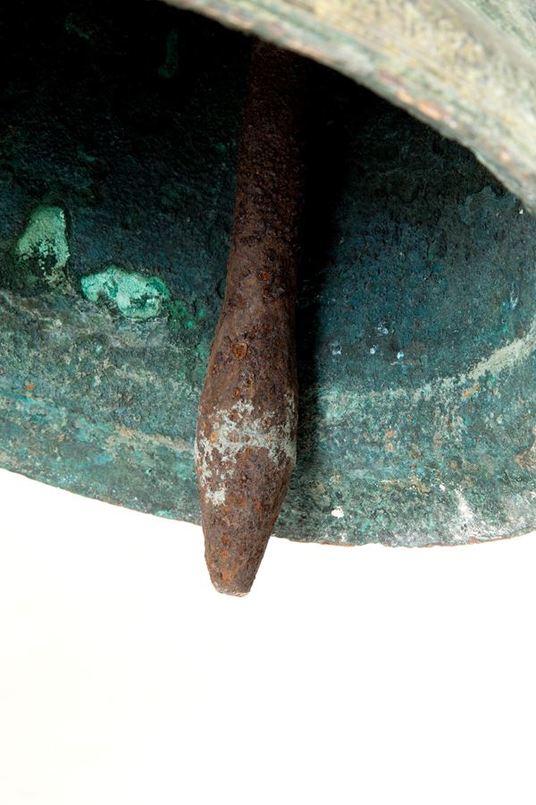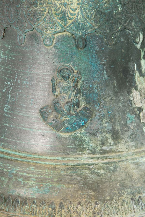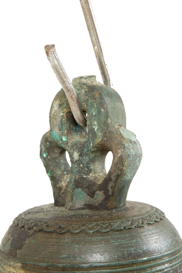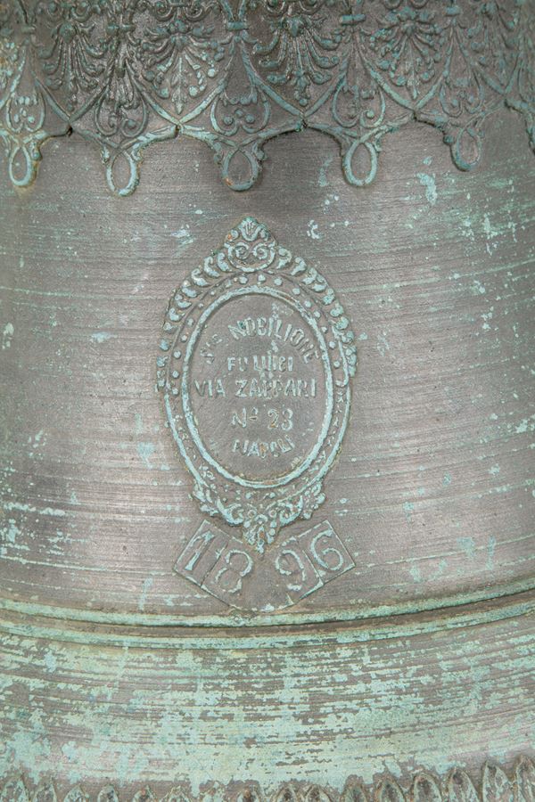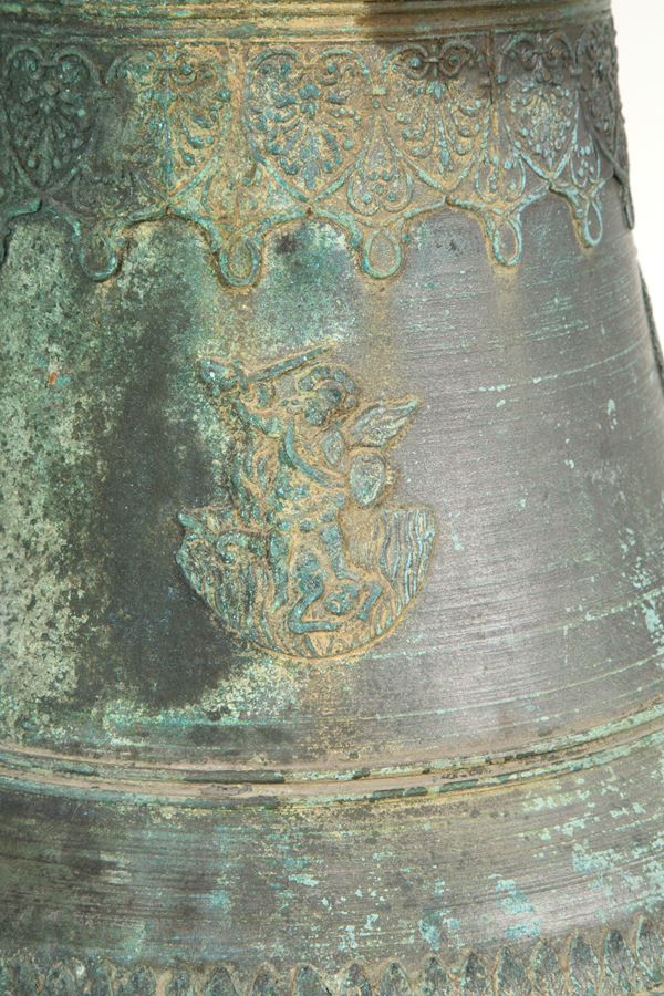 Bronze bell decorated with band festoons, the image of Jesus the Redeemer and Saint Michael the Archangel. Signed SALVATORE NOBILIONE, Napoli 1896 on the side.