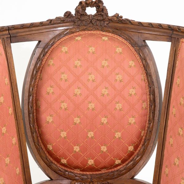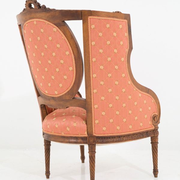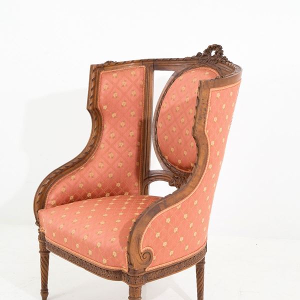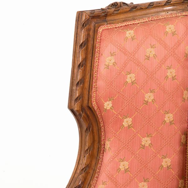 Bergere in carved and perforated wood with ribbon and bows with seat and back in floral patterned fabric. Piedmont. Nineteenth century.