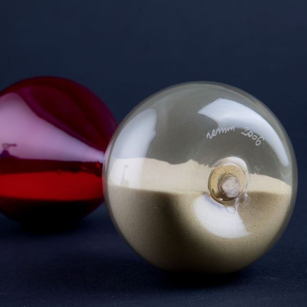 Hourglass in straw-coloured and red Murano blown glass. VENINI production. Signed and dated 2006 on the bottom.