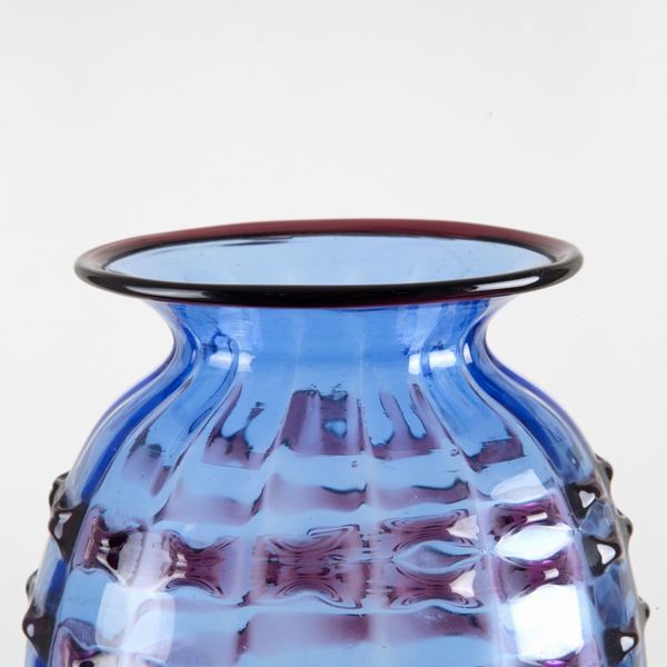 Blue Murano blown glass vase with relief decorations and purple rim.
