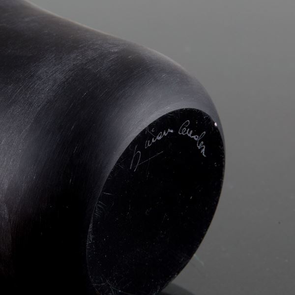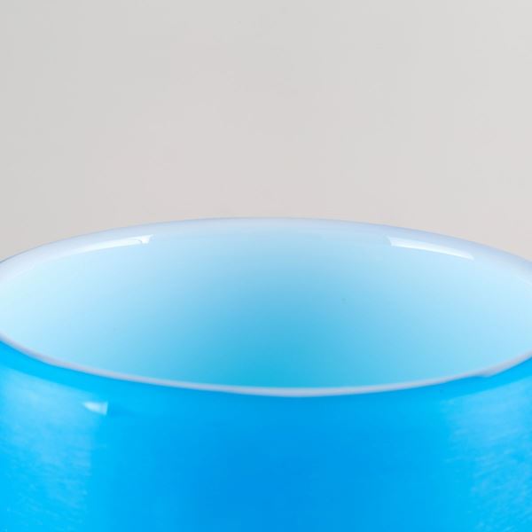 Murano glass vase coated in blue, black and white inside. Signed on the bottom.