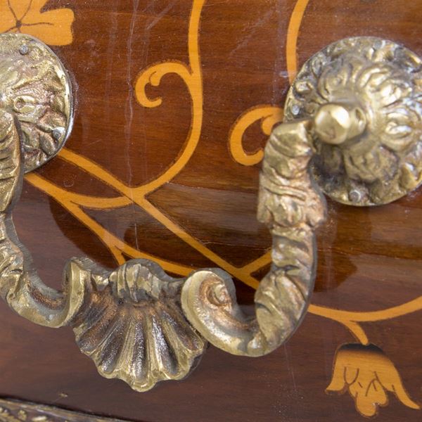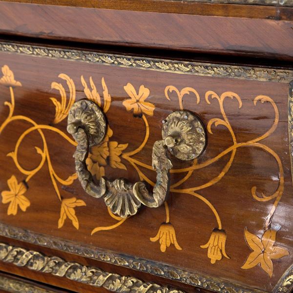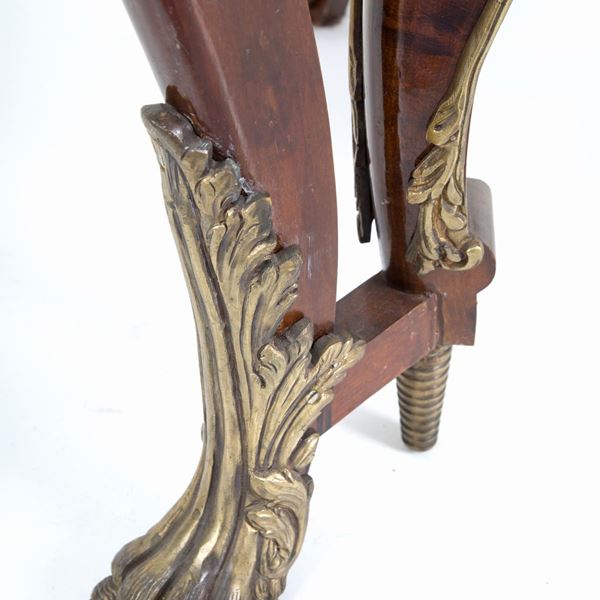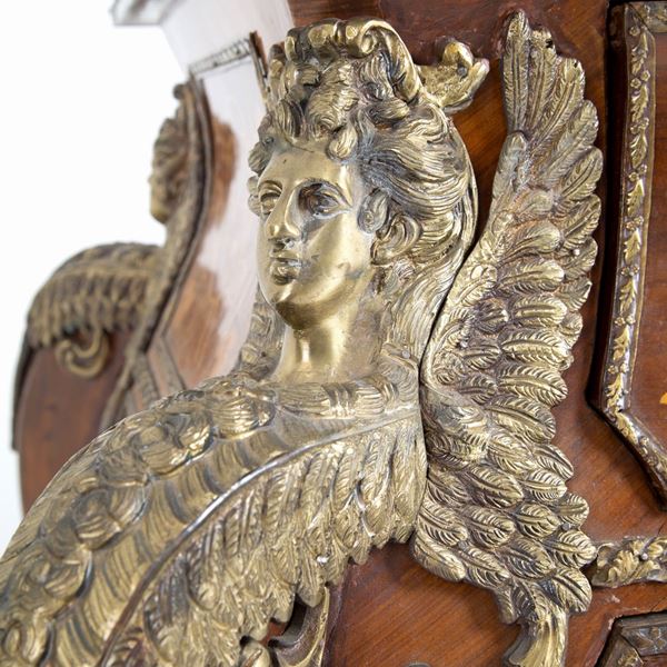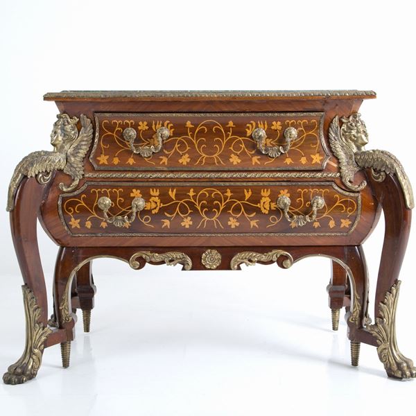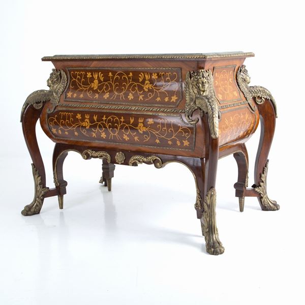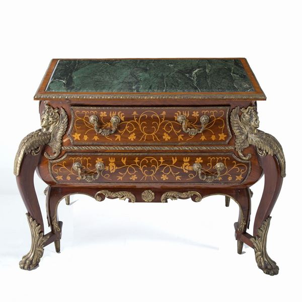 Inlaid center cabinet with bronze finishes, green marble top. 20th century.