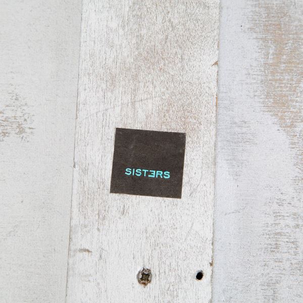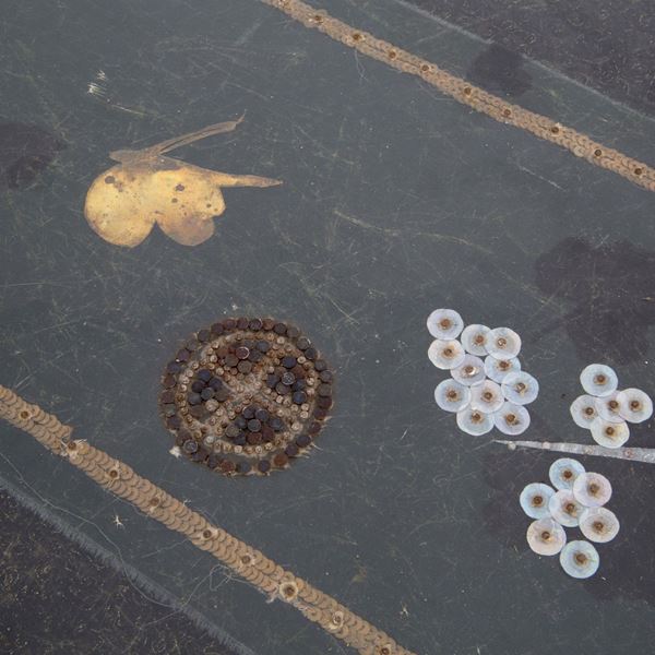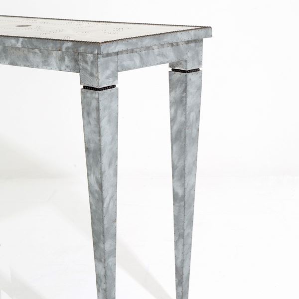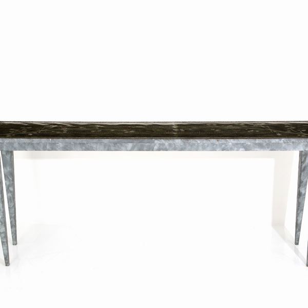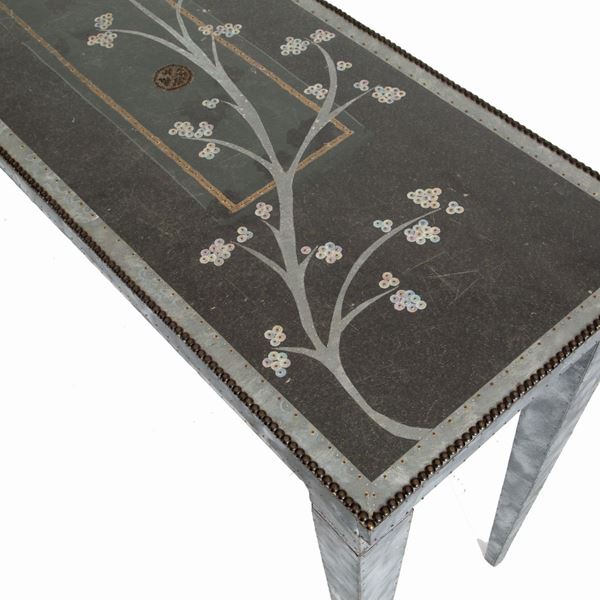 Wooden console table covered in sheet metal with top decorated with flowering branches and butterflies. SISTERS production, Rome. With manufacturer's label under the top. Signs of wear and tear of time.