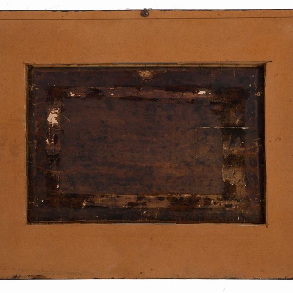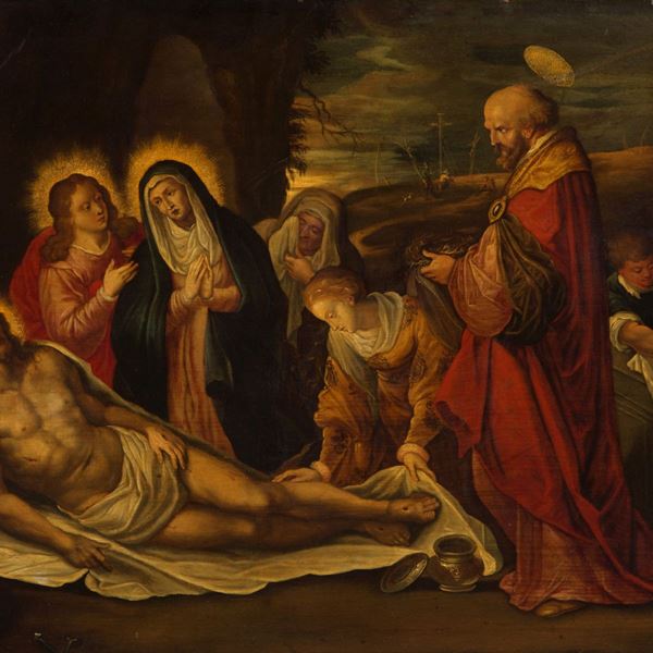Oil painting on panel depicting "DEPOSITION OF CHRIST". In a non-coeval frame. Restorations.