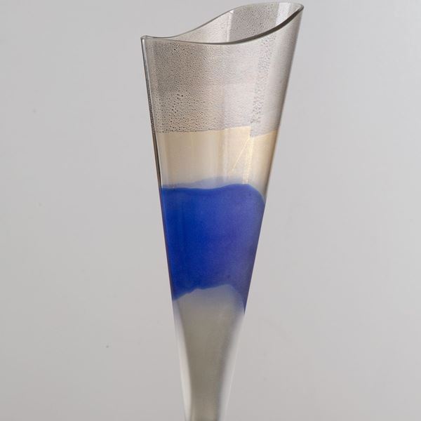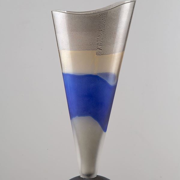 Vase in satin Murano glass with blue, gold and smoky gray bands.