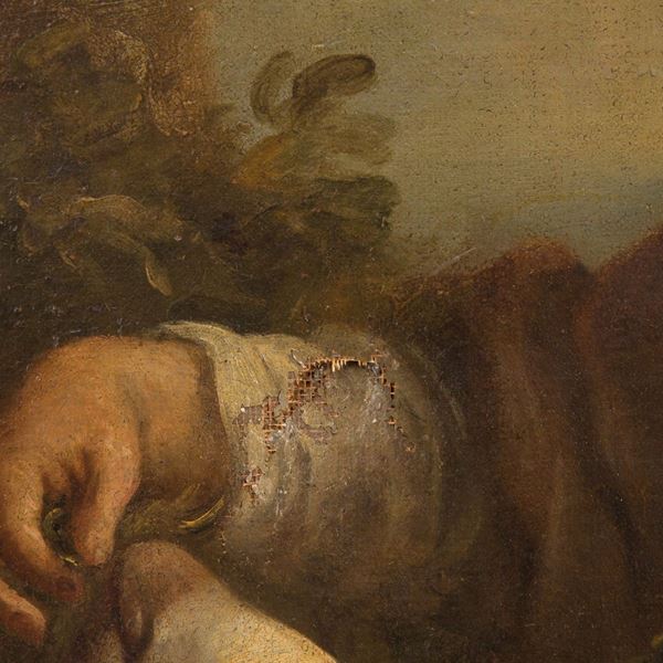 Oil painting on canvas depicting "CHARACTERS WITH SHEEP". 19th century. In frame. Already relined and reframed. Defects and restorations.