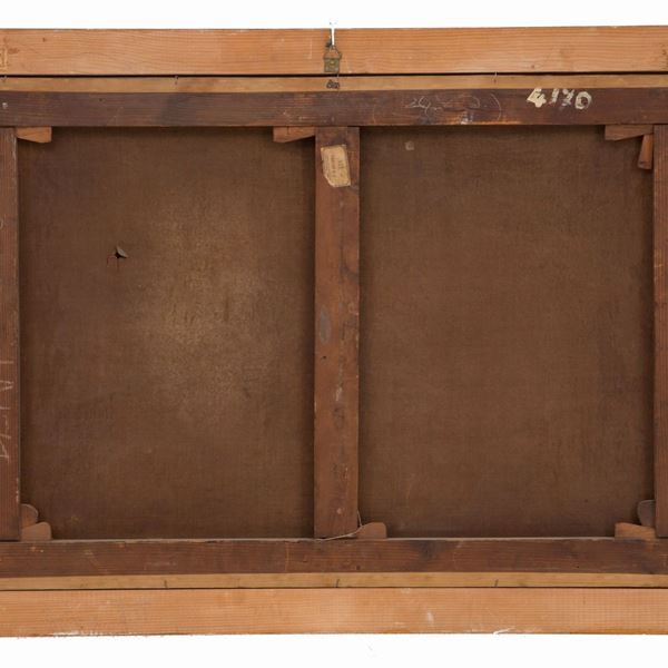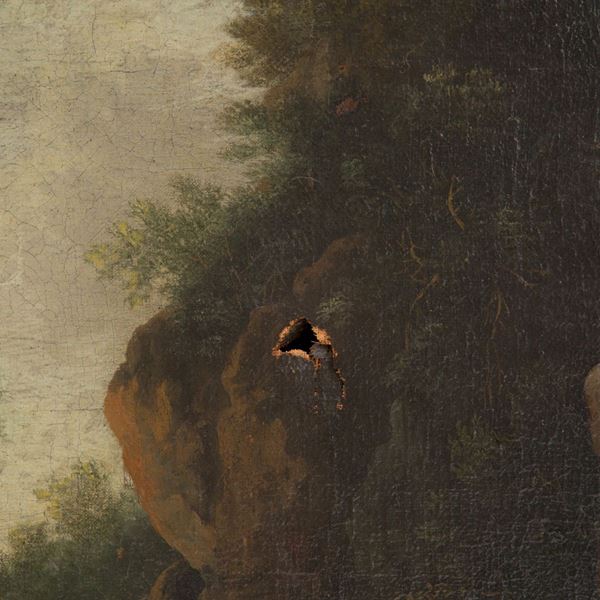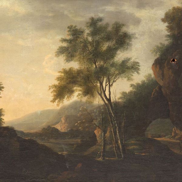Oil painting on canvas depicting "LANDSCAPE WITH WALKERS". 18th century. In frame. Already relined and reframed. Defects and restorations.