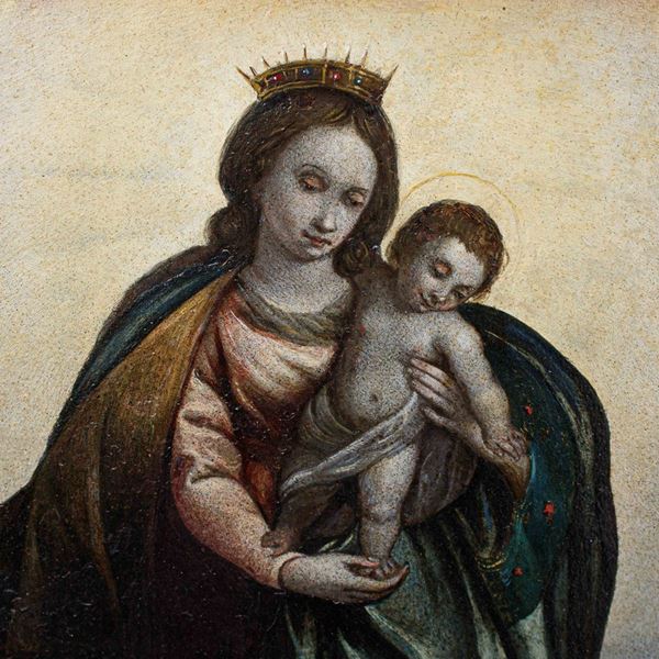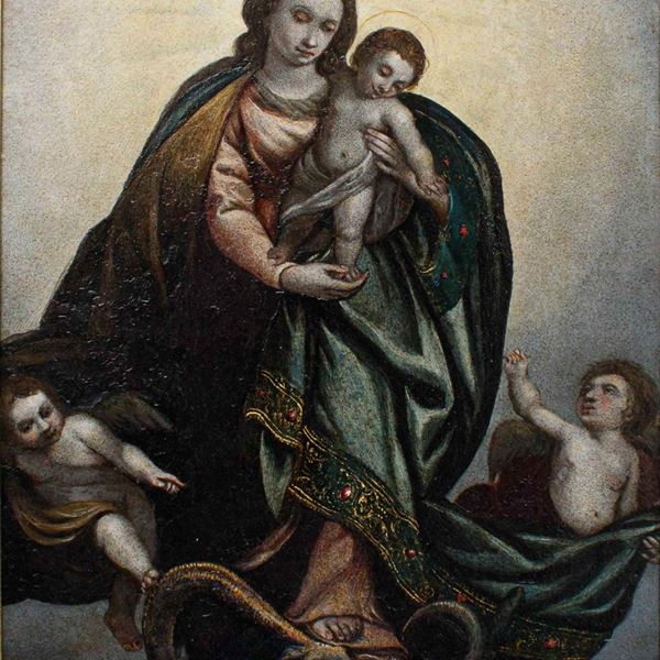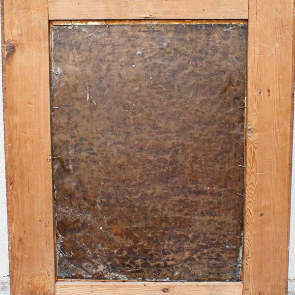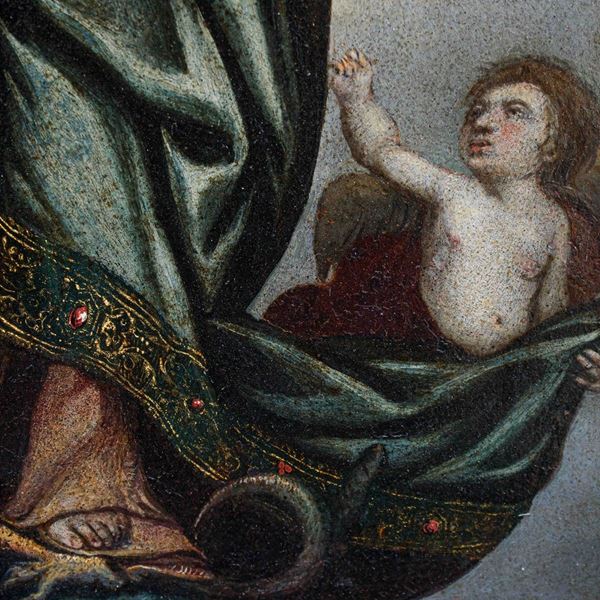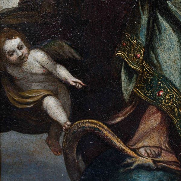 Oil painting on copper depicting "MADONNA OF THE APOCALYPSE". 17th century. In frame.