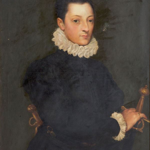 Oil painting on canvas depicting "SWORDSMAN". Late 19th century. In frame. Defects and restorations.