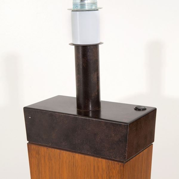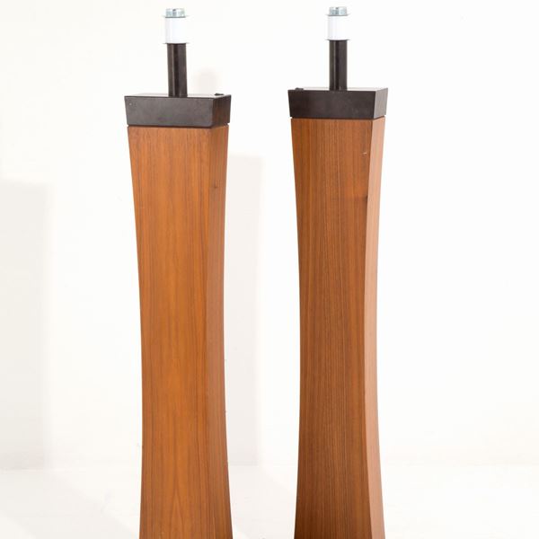 Pair of wooden and iron floor lamps. 1970s. Defects.