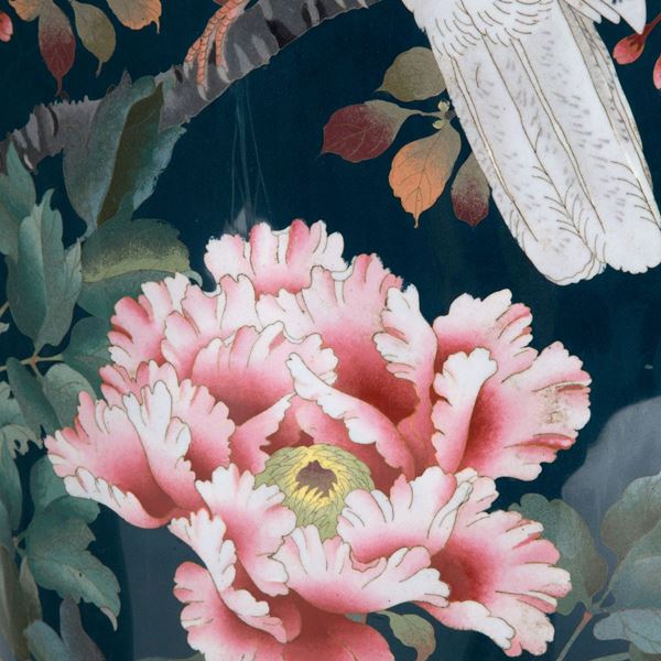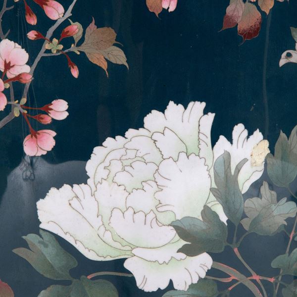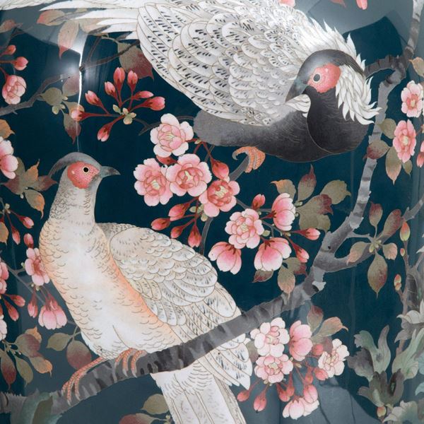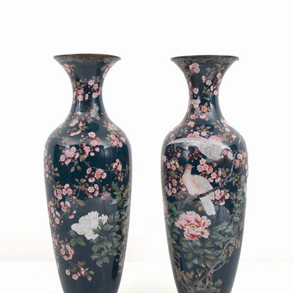 Pair of large enamelled copper vases with a green background decorated with floral and bird motifs. Wooden bases. Japan. 20th century. Small defects.