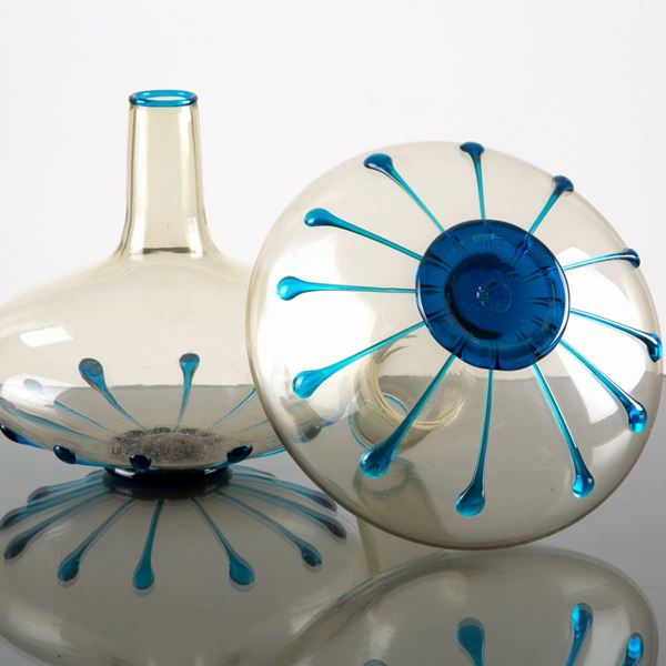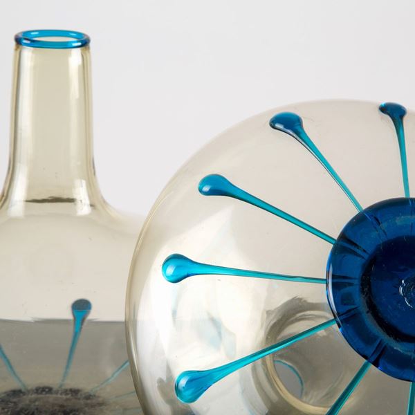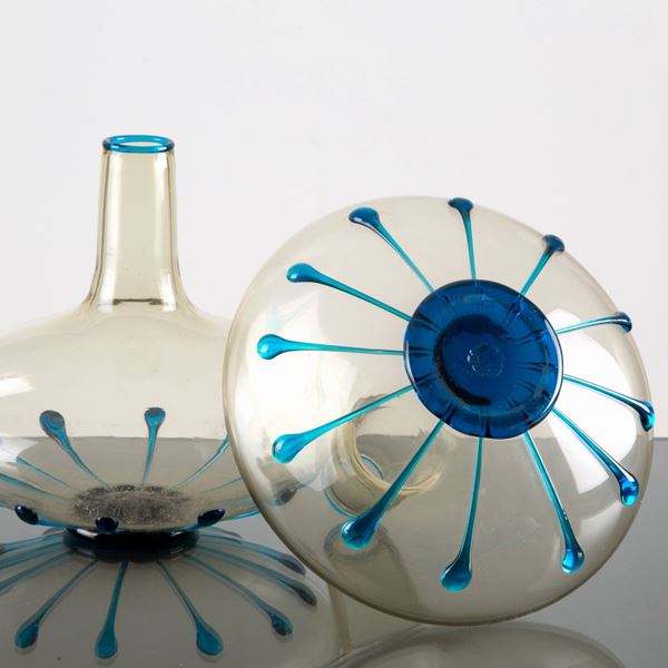 Pair of amber Murano blown glass vases with turquoise rays, base and rim.