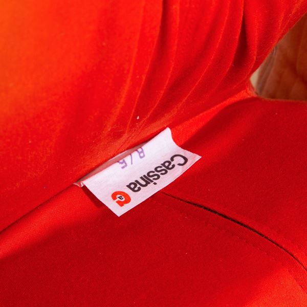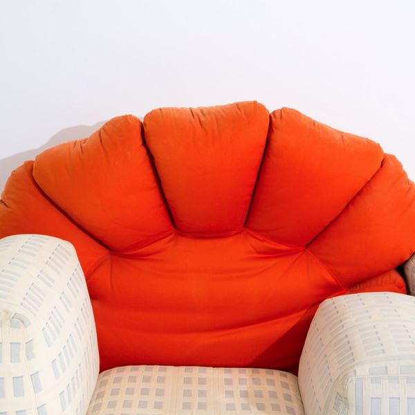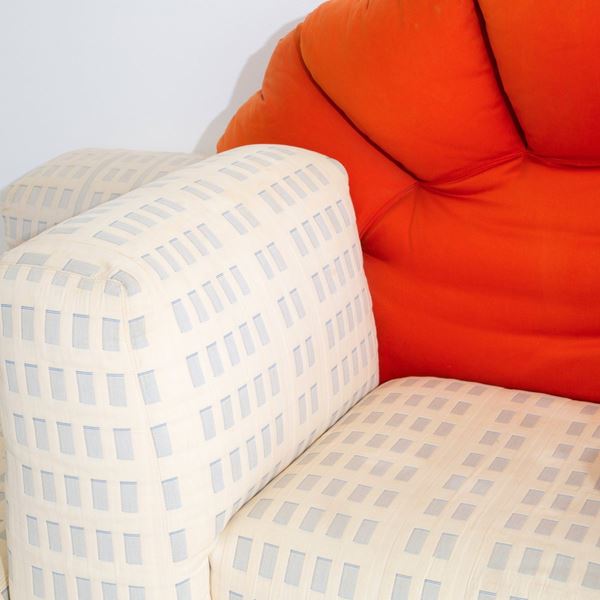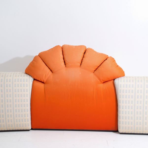 Tramonto a New York sofa in wood, expanded polyurethane and upholstery in red fabric for the sun-backrest and cream-coloured with gray squares for the skyscraper-seats. CASSINA production. Exemplary 5/40. 1980s. With manufacturer's label under the left sunbeam. Signs of wear and tear of time. Published in Opuscolo Collezione Cassina, 3rd Edition , Meda 1986, pp. 90-91; G. Bosoni, Made in Cassina, Skira, Milan 2008, p. 268 e G. Gramigna, Repertorio del design italiano 1950-2000, vol. 2, Allemandi, Turin 2003, p. 282.