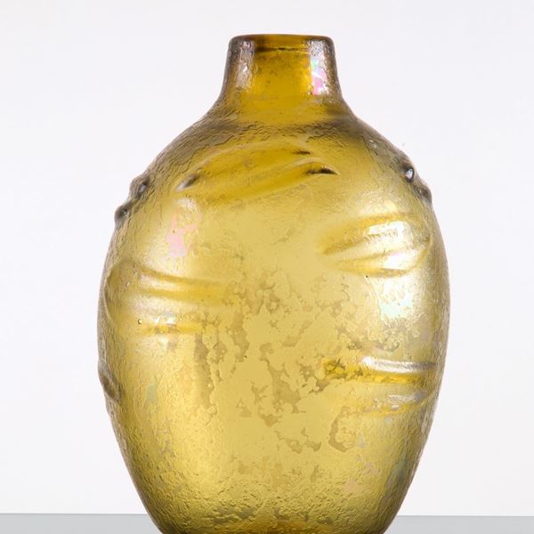 Corroded vase from the Rilievi series, model 3695, in straw-colored Murano glass decorated with hot-applied reliefs in the shape of mouths. Signed VENINI, Murano on the bottom.