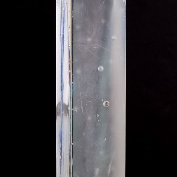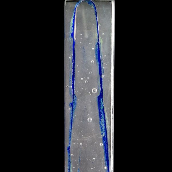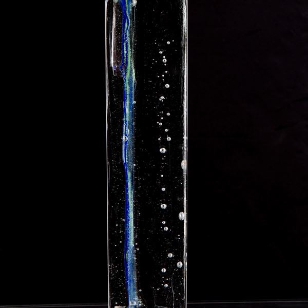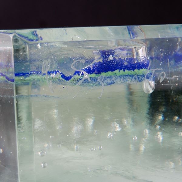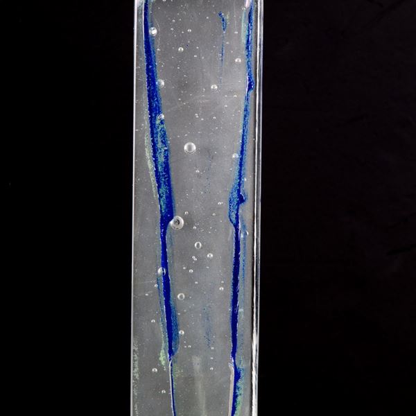 Transparent Murano glass paste sculpture with bubbles and blue streaks. Signed below.