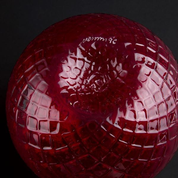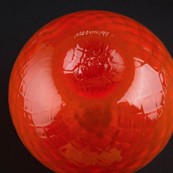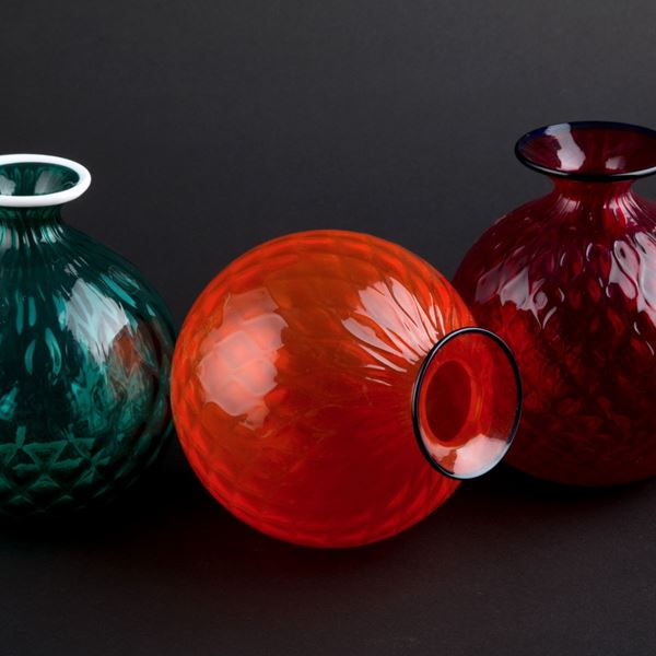 Three Monofiore Balloton vases in red, orange and green Murano blown glass. VENINI production. Two with manufacturer's label. Marked and dated '96, '99 and 89 respectively.