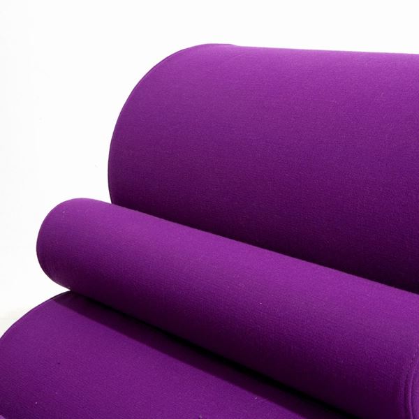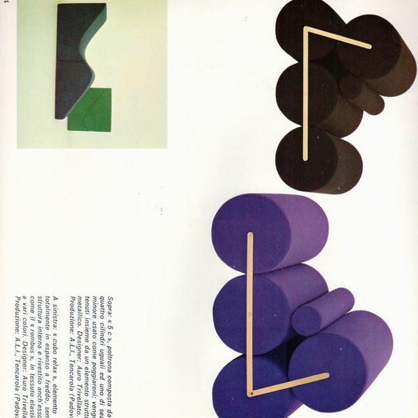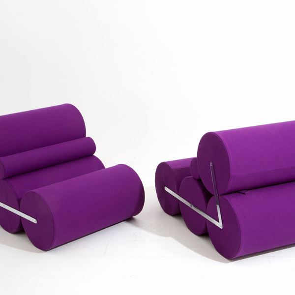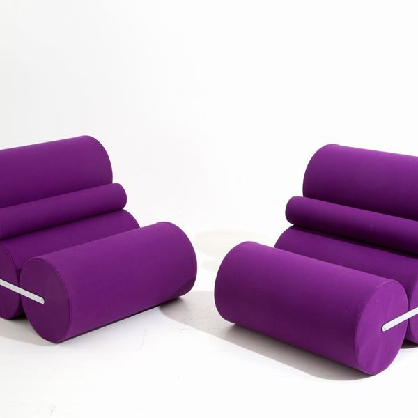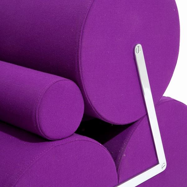 Pair of model 5 C armchairs each composed of four identical cylinders and one of smaller section, used as a lumbar support, in purple fabric joined by a metal structure. Production A.L.I., Tencarola (Padua). 1972. Published in the Arredorama magazine, n. 14, May 1972, p. 14.