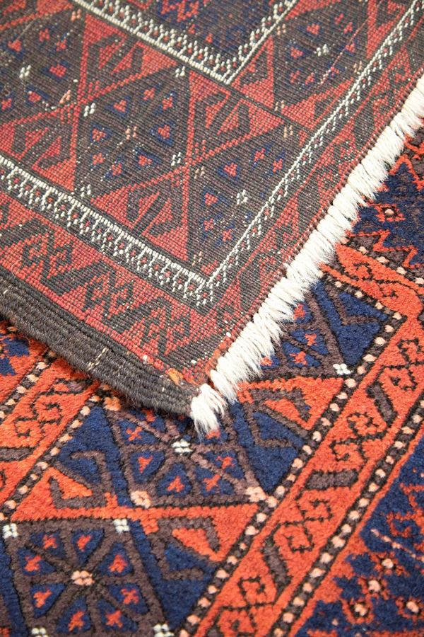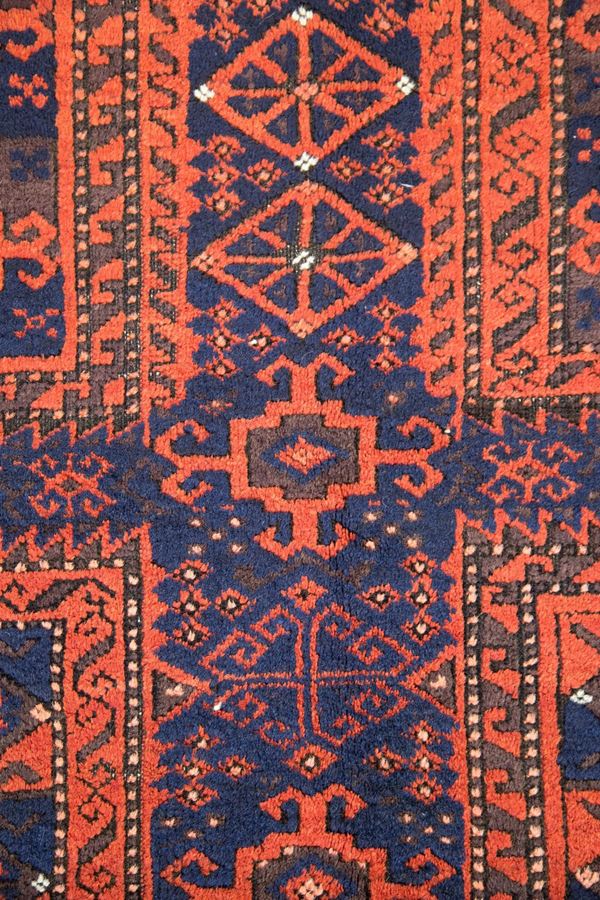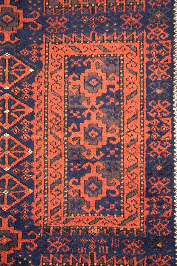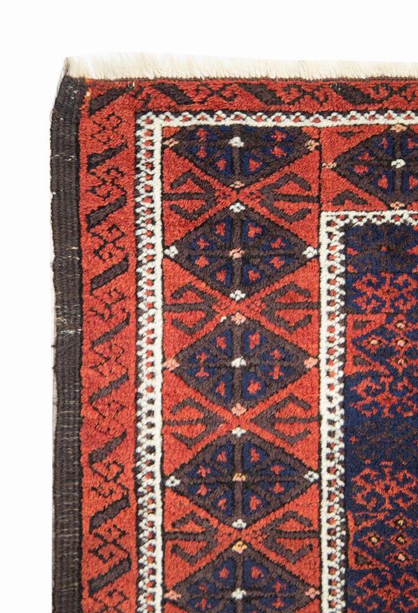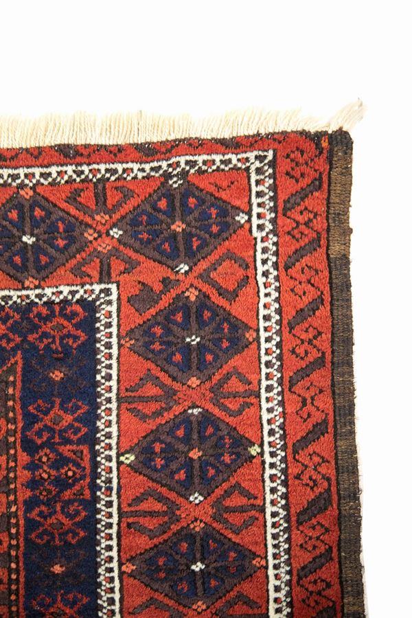 Baluch rug. Persia. Around 1900. Fleece field, no field restorations, natural brown corrosion, missing in one headstock.