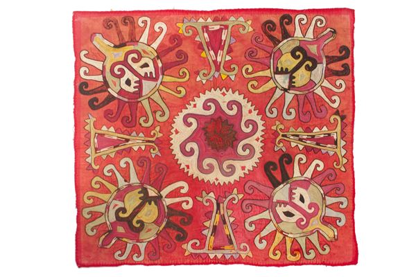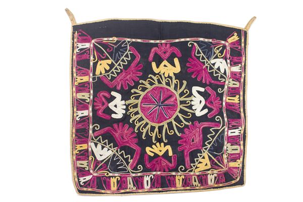 Two hand-embroidered Lakai fabrics on a cotton background. Tajikistan. Early 20th century. Excellent state of conservation. Red fabric measurements: approx. 55x50 cm. Black fabric measurements: approx. 48x50 cm.