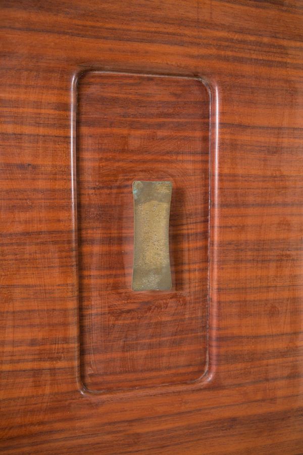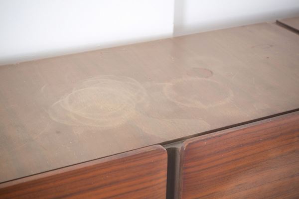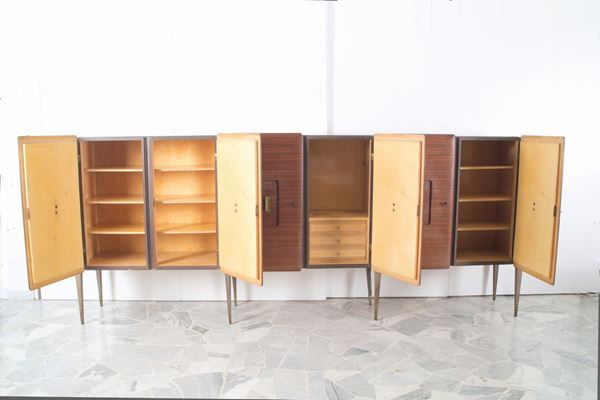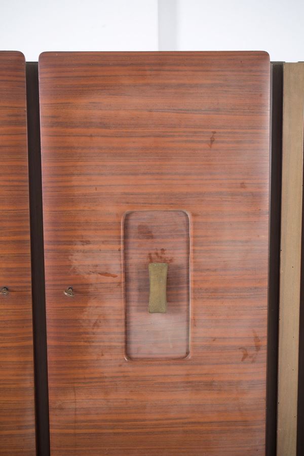 Sideboard in various woods with brass handles and tips, composed of three modules with two doors each with internal shelves and six drawers in the central module. 60's. Defects and signs of wear over time.