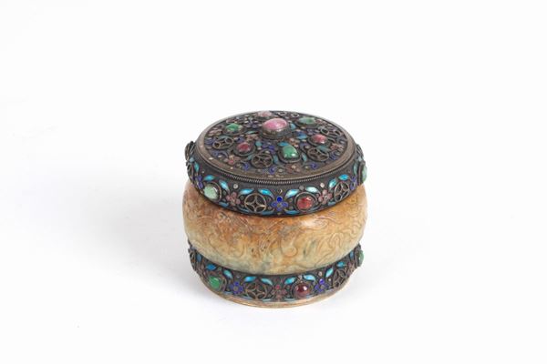 Finely chiselled and enamelled silver box with jade body and set with hard stones. China. 20th century.
