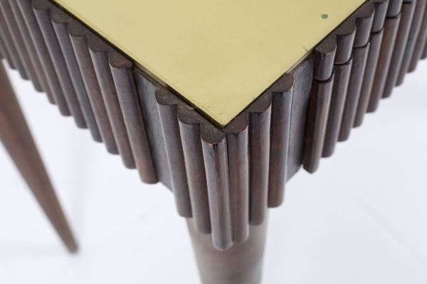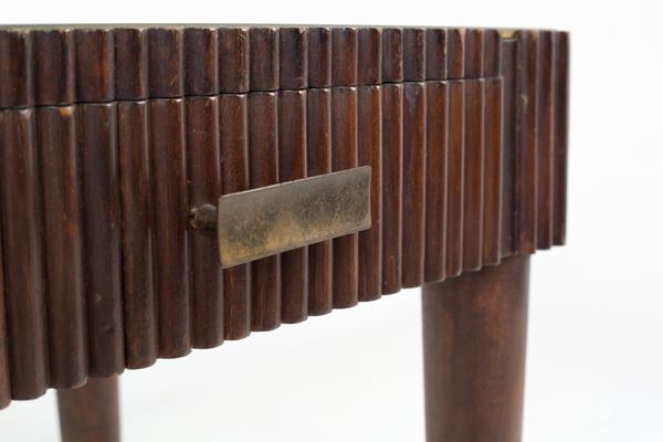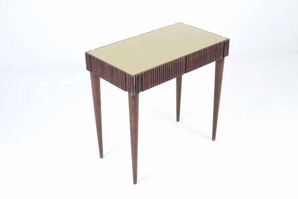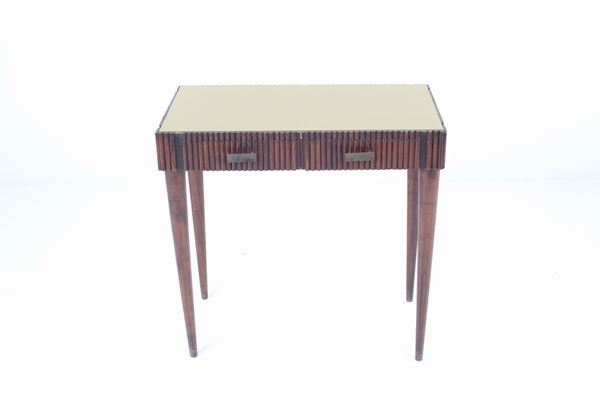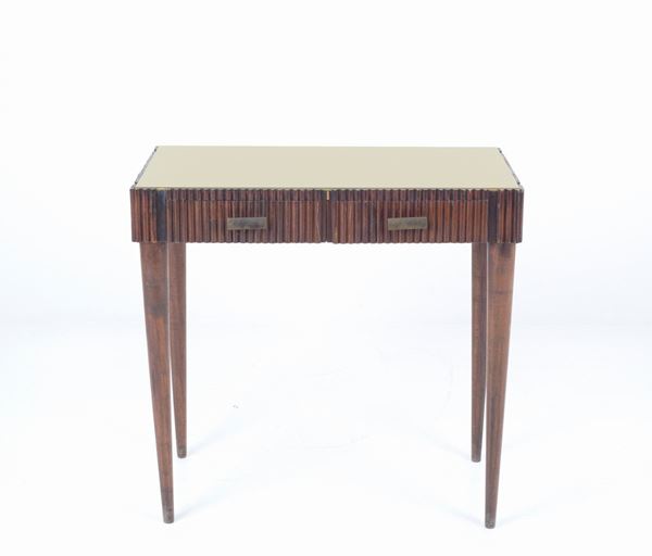 Center desk in grissinato wood with back-painted glass top and two drawers on the band with bronze fittings. 1950s-60s.
