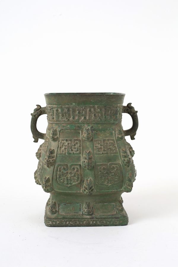 Bronze vase with relief writing and handles in the shape of foo dogs. China.