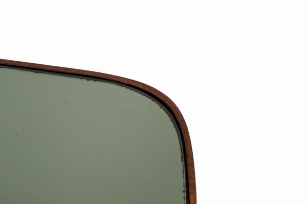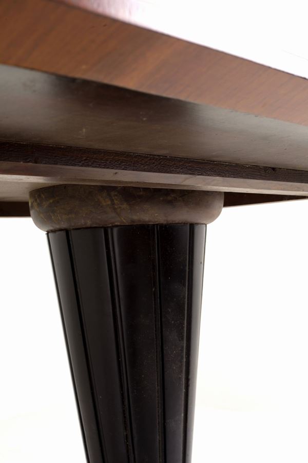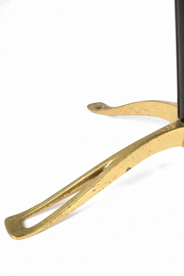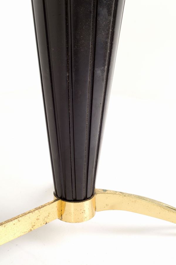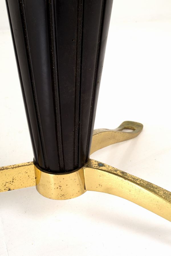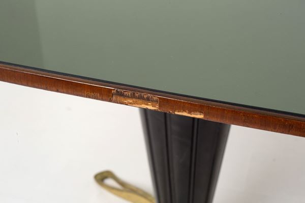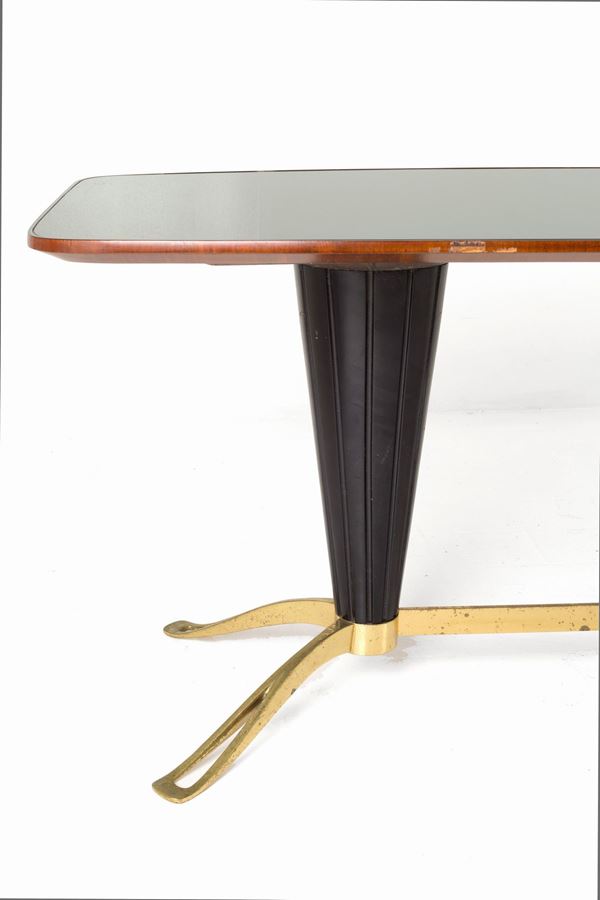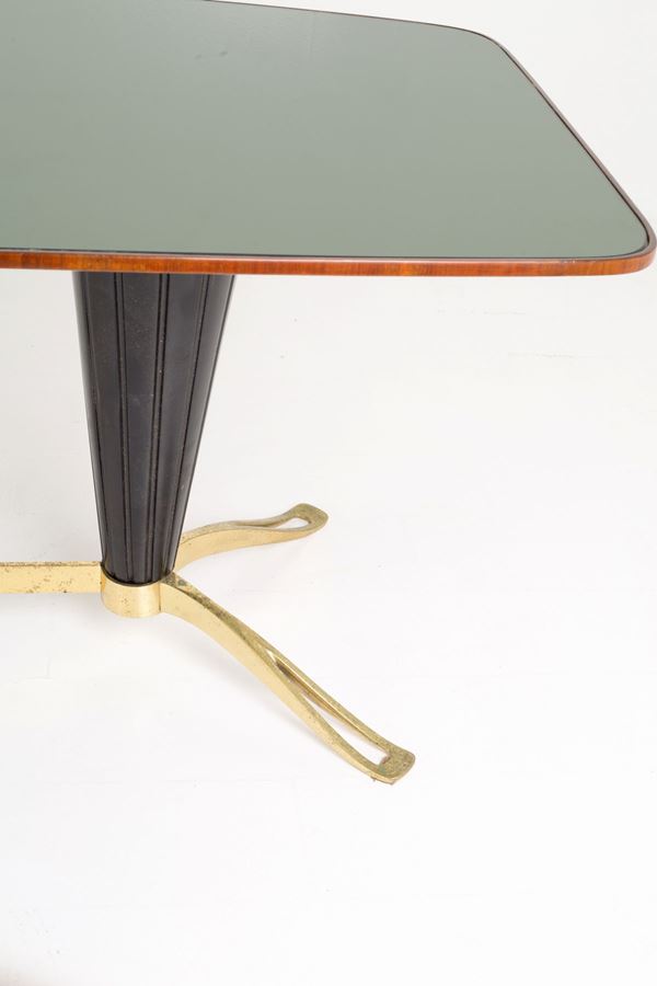 Large shaped table with wooden structure and legs, back-painted glass top and brass feet and crosspiece. 60's.