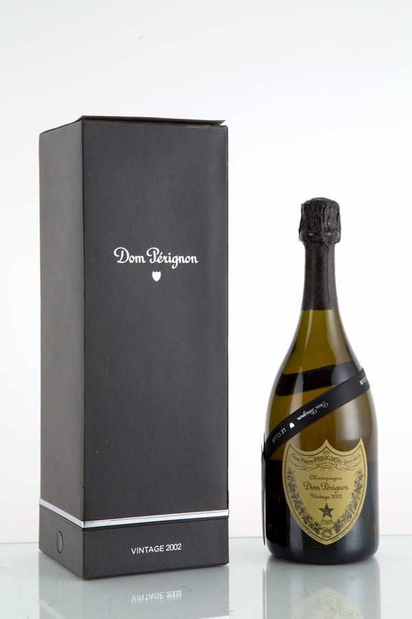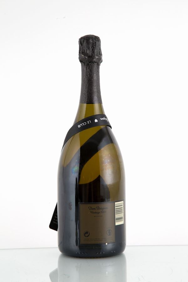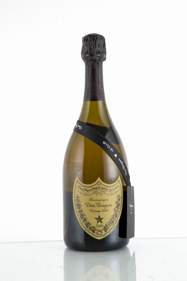 A bottle of Dom Pérignon Vintage 2002 Champagne Brut. Box, booklet and tag from Dom Pérignon Le Club.