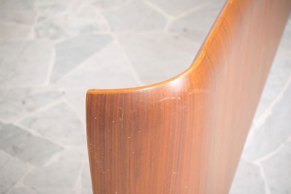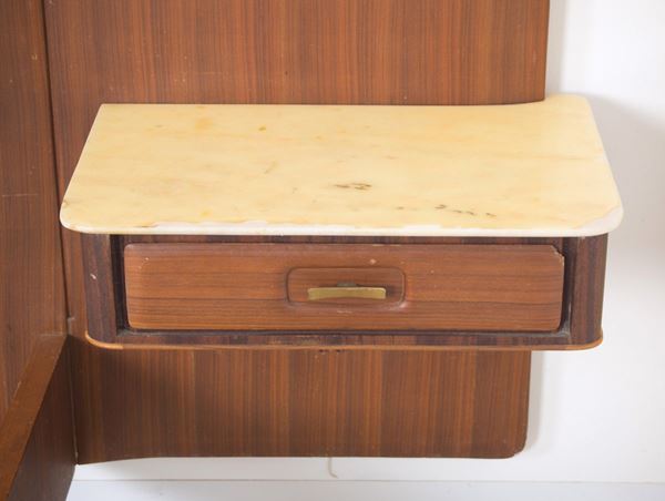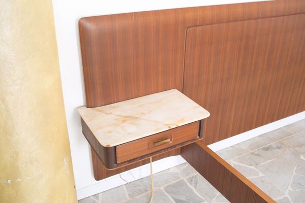 Double bed with hanging bedside tables in teak veneered wood with onyx tops and brass handles and feet. 60's. Minor defects and signs of wear over time.