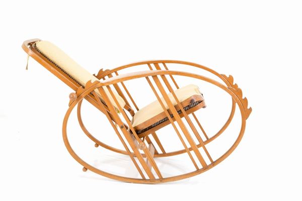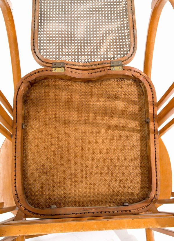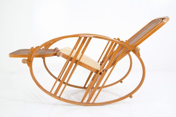 "Egg" rocking chair model 267 in bent wood, Vienna straw and seat covered in cotton. Production SOCIETA' ANONIMA ANTONIO VOLPE, Udine (Attr.). Early 20th century. Signs of wear over time.