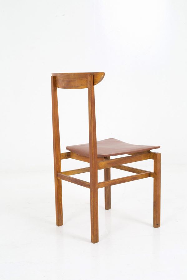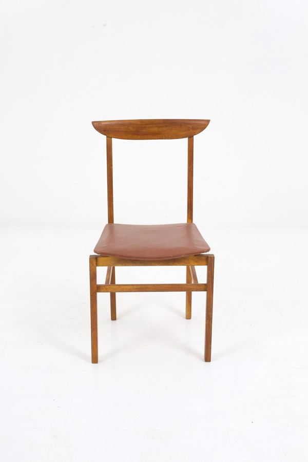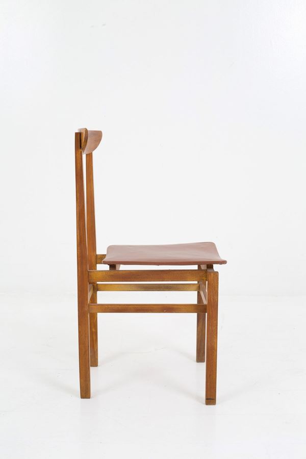 Four wooden chairs with brown sky seat. 60's. Defects and signs of wear over time.
