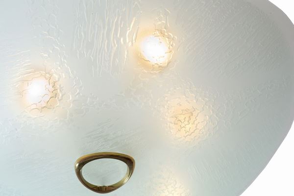 Model 1748 chandelier in gilded brass and polished and etched glass with relief decorations. FONTANA ARTE production. 1950s. Signs of wear over time.